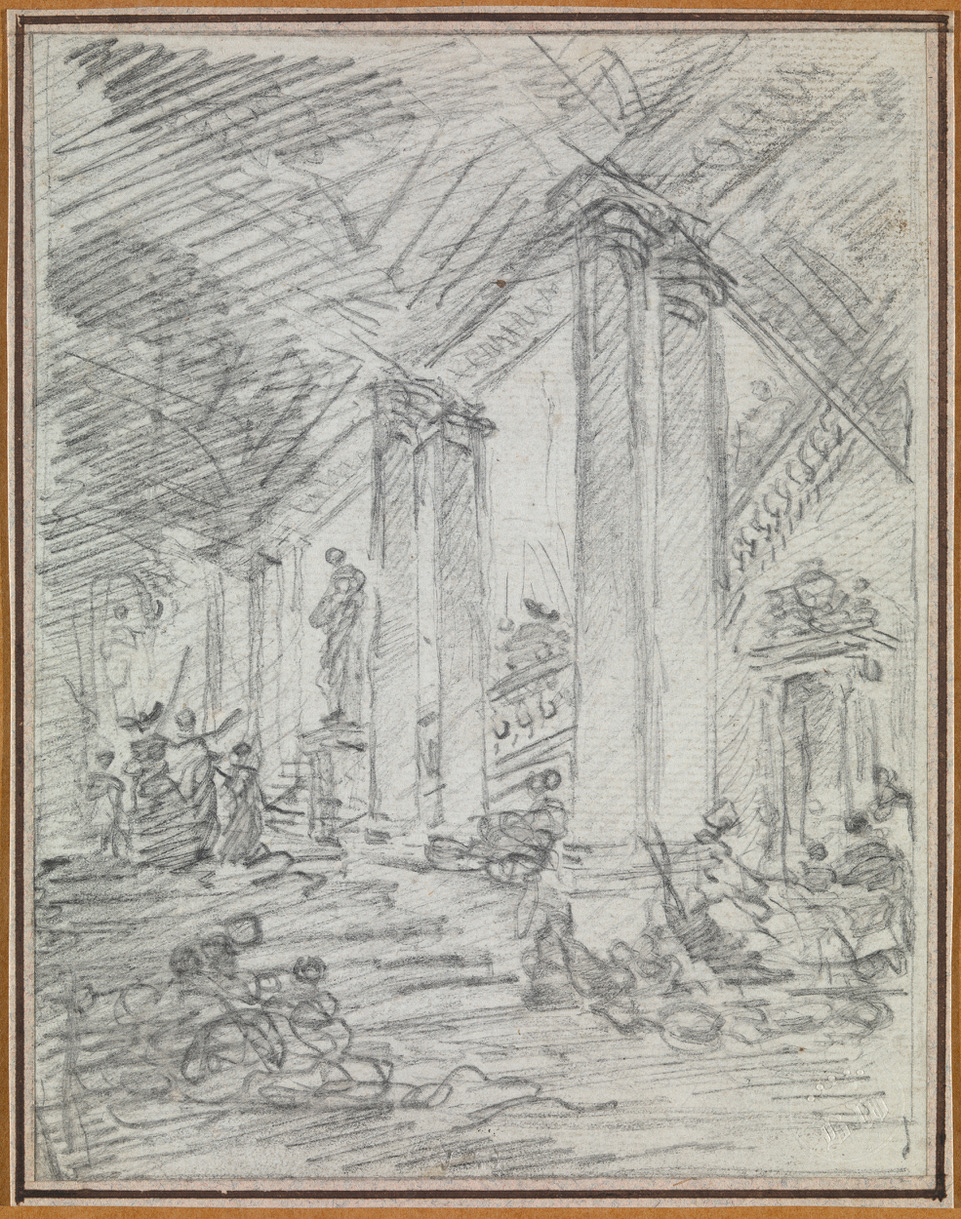 A student of the sculptor Michel-Ange Slodtz, Hubert Robert travelled to Rome in 1754 in the retinue of the new French ambassador to the Vatican, the future Duc de Choiseul. It was probably through the influence of Choiseul that, although he was not officially a pensionnaire at the Académie de France in Rome, the young Robert was able to study there for several years. Succinctly described by the director of the Académie de France, Charles-Joseph Natoire, as a young man ‘who has a penchant for painting architecture’ (‘qui a du goût pour peindre l’architecture’), Robert spent a total of eleven years in Italy, mostly in Rome. He fell under the particular influence of Giovanni Paolo Panini, the leading Italian painter of architectural views and capricci, who taught perspective at the Académie de France. Robert’s earliest paintings and drawings, both in composition and technique, are greatly indebted to the example of Panini. At the Académie de France Robert met and befriended Jean-Honoré Fragonard, and with him made sketching tours of the countryside around Rome.