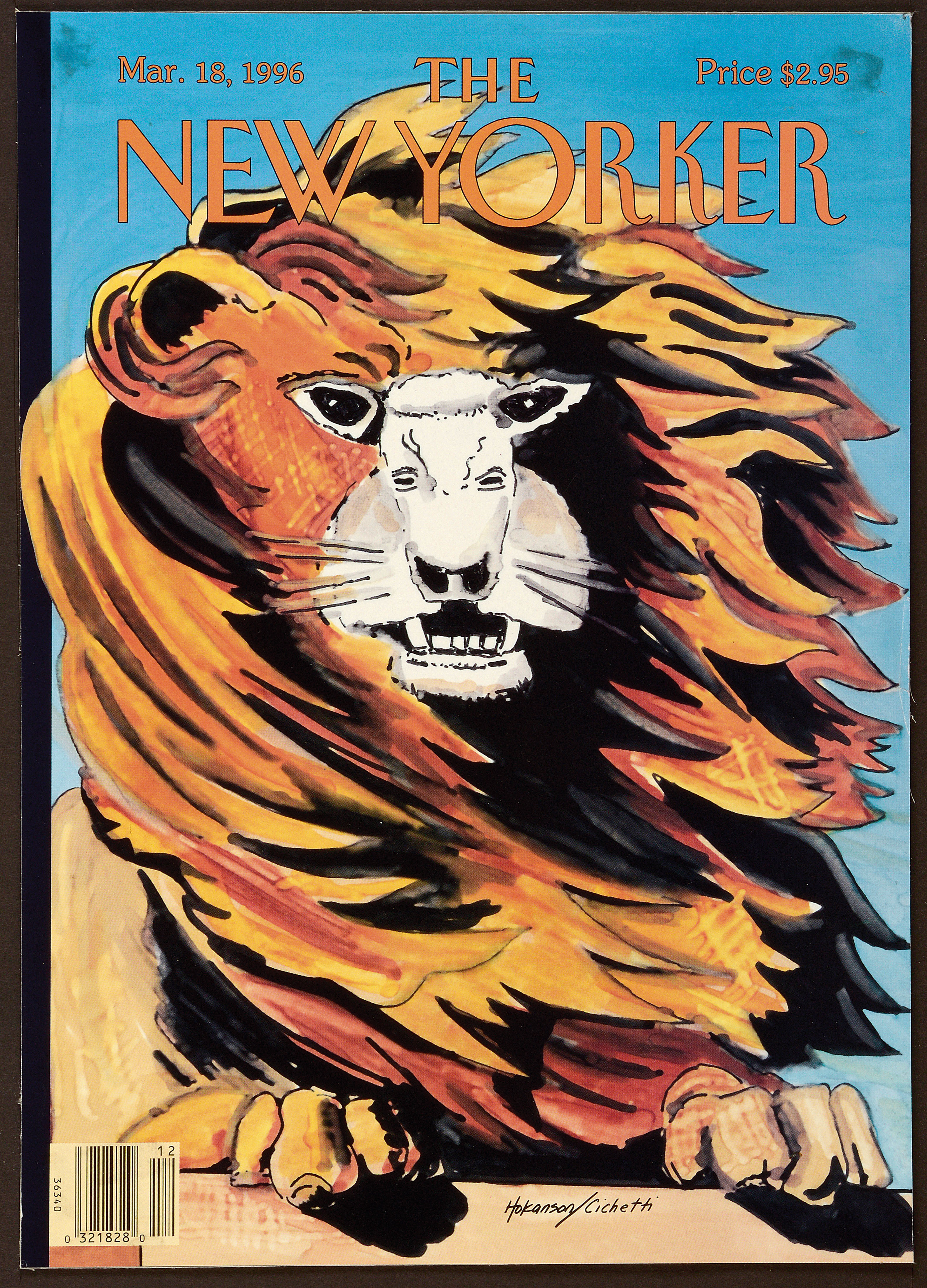 Lars Hokanson and Frances Cichetti contributed designs for only two covers for The New Yorker, in March and August 1996, as well as a cartoon for the Westminster Dog Show, entitled ‘Top Dogs’, which appeared inside the February 19, 1996 issue of the magazine.