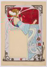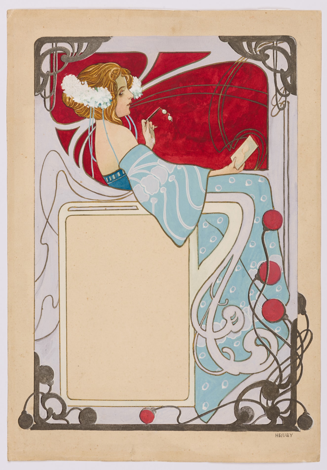 An accomplished decorative artist and painter, Segius Hruby also worked extensively as a graphic designer and illustrator, regularly contributing to the satirical weekly magazine Die Muskete - which devoted a special issue to Hruby’s work in November 1927 - between 1925 and 1933, as well as the magazine Faun. The present sheet, a design for a poster or advertisement, would seem to be datable to around 1900, when the artist was particularly influenced by the Art Nouveau or Jugendstil aesthetic. Hruby designed similar posters during the same period, one of which was used to announce an exhibition of work by students at the Teplitz school in 1900.