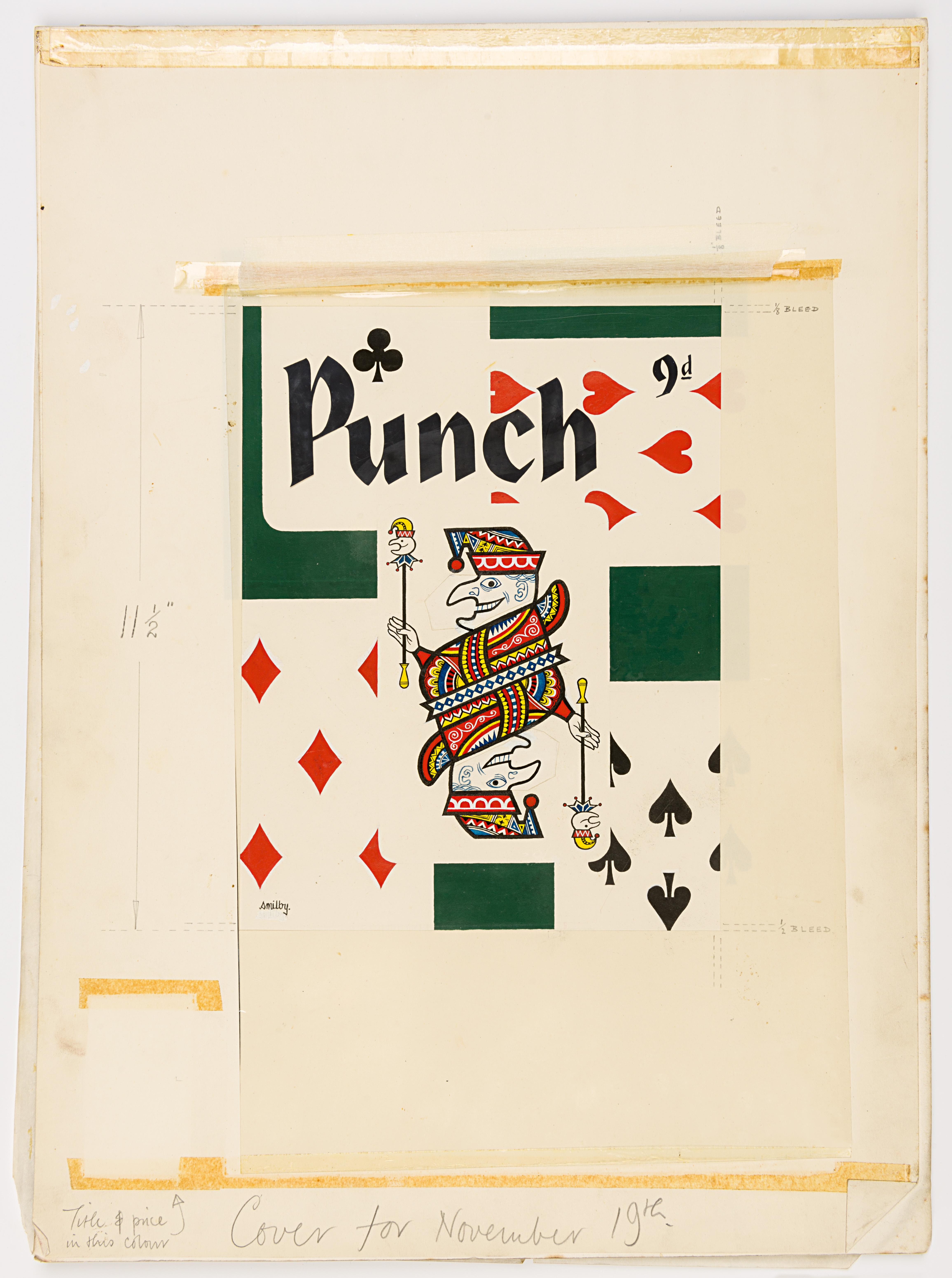 Previously overlaid with a mount sheet inscribed Cover for November 19th. in the bottom margin and Title & price / in this colour at the lower left, as well as dimensions and printing instructions. Also previously overlaid with a transparent sheet inscribed with the Punch logo and the price 9d in black ink.