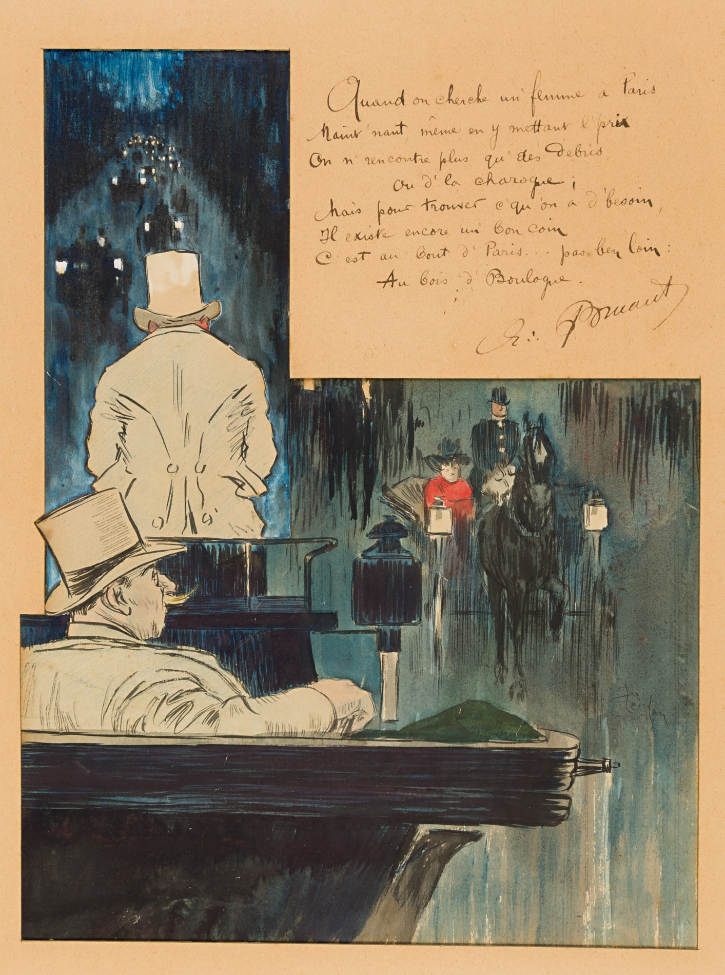Inscribed and signed (by Aristide Bruant) 'Quand on cherche un femme à Paris / Maint’nant même en y mettant l’prix / On n’rencontre plus qu’ des debris / ou d’la charogne; / Mais pour trouver c’qu’on a d’besoin / Il existe encore un bon coin / C’est au bout d’Paris…pas ben loin: / Au bois d’ Boulogne. A Bruant' on the mount.