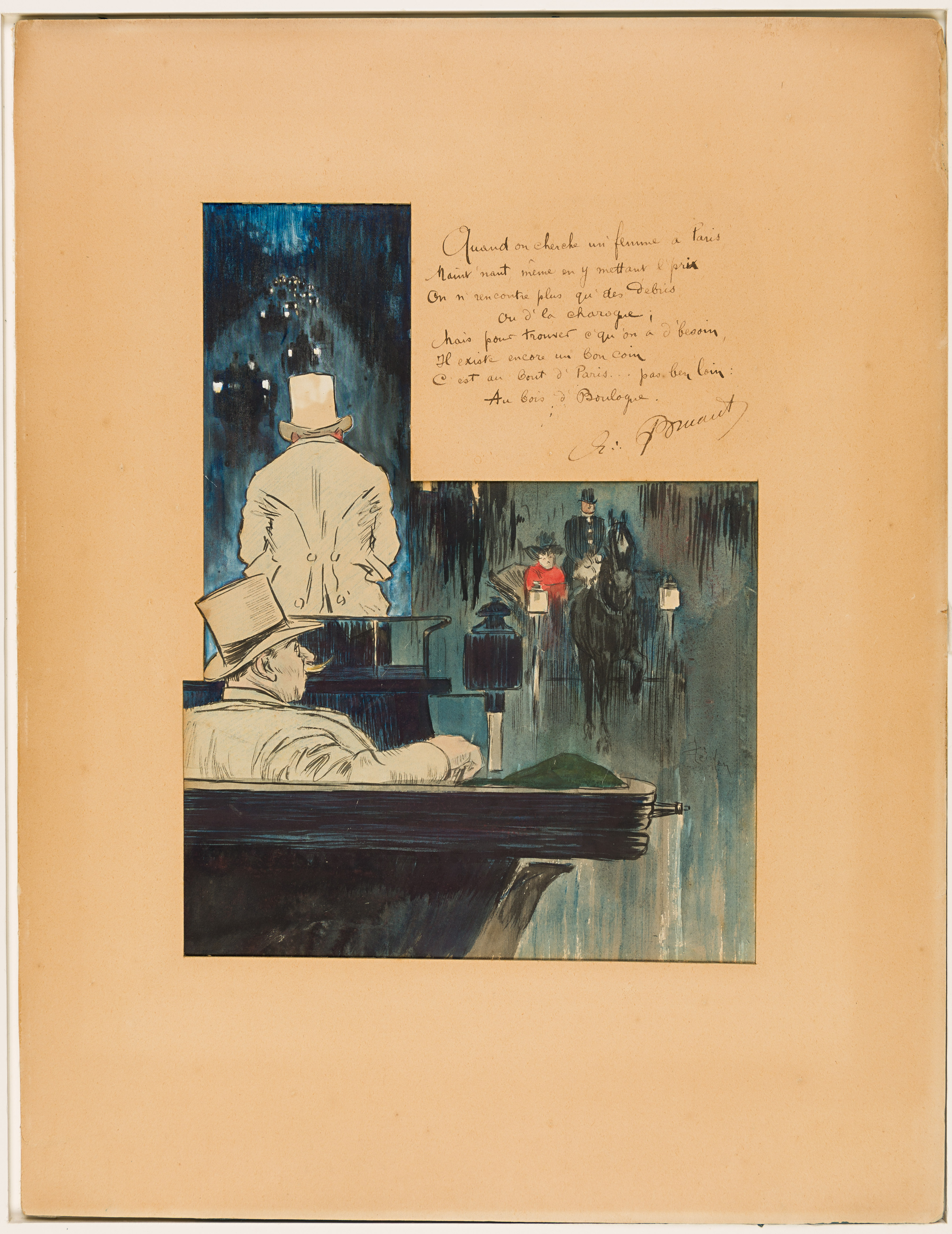 This drawing by Steinlen illustrates the song ‘Au Bois de Boulogne’ by Aristide Bruant, and was used for the cover of the July 1891 issue of Le Mirliton, a Parisian journal founded by Bruant in 1885 and named after his café of the same name. The cover, as eventually printed, incorporated the score and the lyrics of the song, which alludes to the nocturnal activities known to take place in the Bois de Boulogne, the large park near the western edge of Paris. The lyrics to the song, written by Bruant on the mount of this drawing by Steinlen, may be approximately translated as ‘When looking for a woman in Paris / Nowadays, even if one pays good money / We only meet debris / or carrion; / But to find what you need / There is still a good spot / It’s at the end of Paris ... not far away: / At the Bois de Boulogne.’