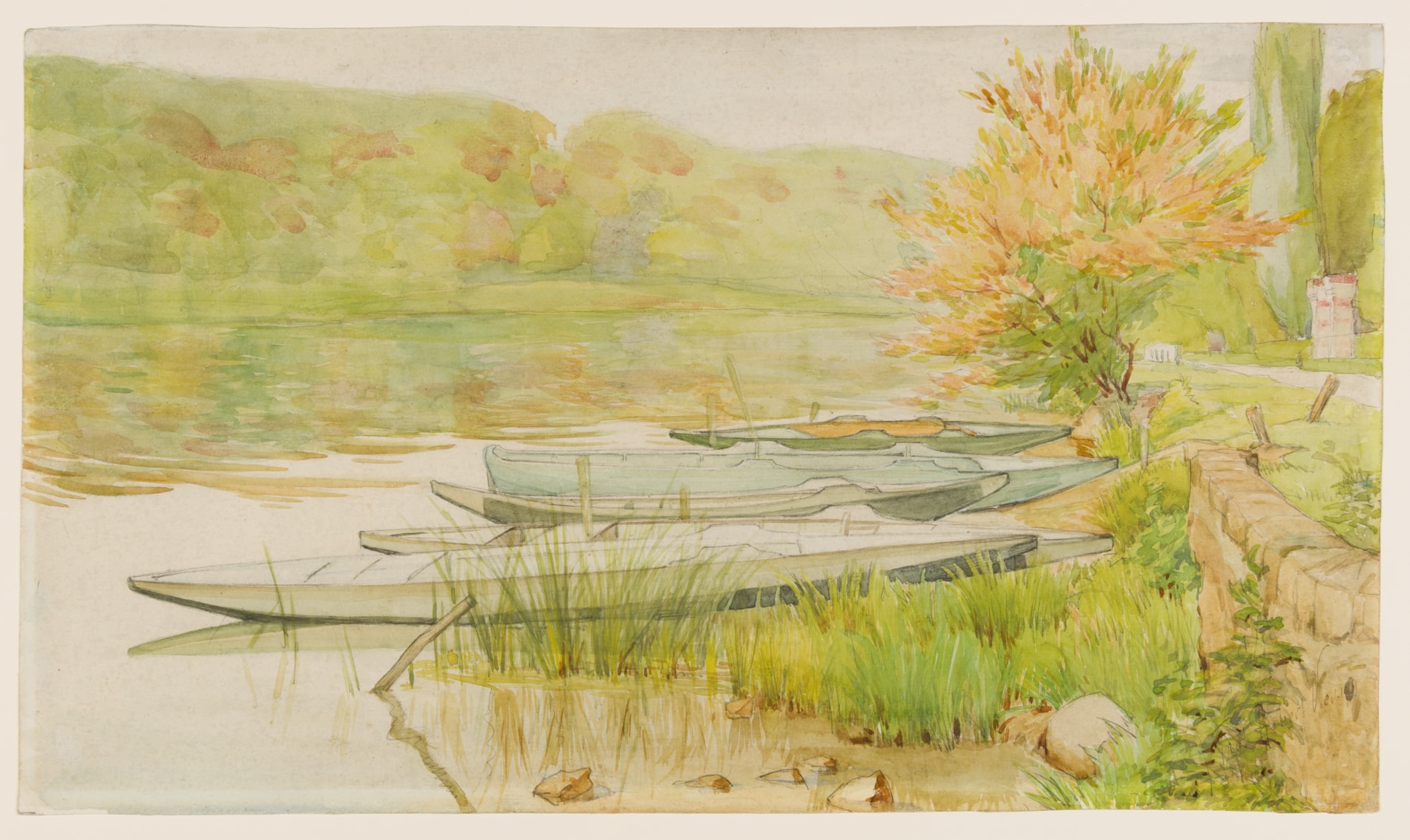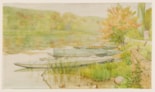 A charming scene of punts at the edge of a lake, the present sheet is a fine example of Léo-Paul Robert’s work during the latter part of his career.