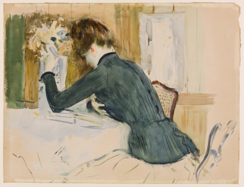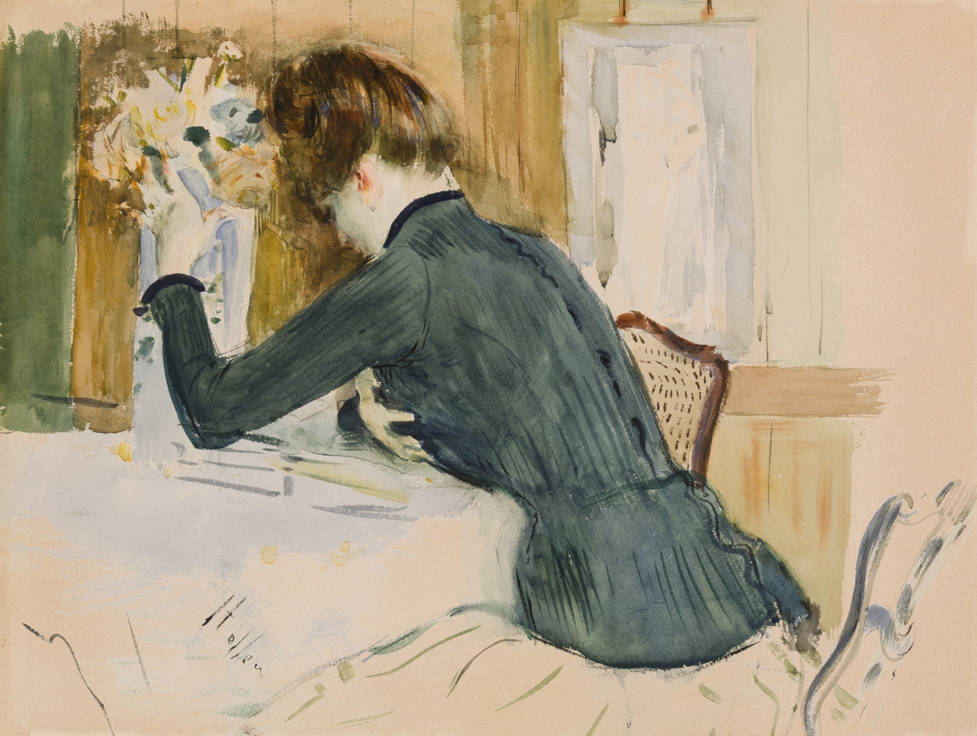 Stylistically comparable to the present sheet is a watercolour study - drawn in 1886 and depicting his wife Alice, during their honeymoon, seated at a desk and seen from behind - in the collection of the Musée Bonnat-Helleu in Bayonne.
