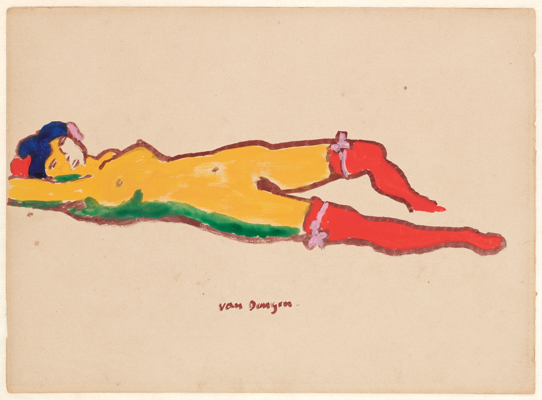 The Fauvist works Kees Van Dongen produced during the five years between 1905 and 1910 are generally considered to be the finest of his career. By 1904, as Fred Leeman has noted, ‘Van Dongen began to apply the bold lines and rough daubs of bright “unnatural” color, as first developed in his works on paper, to his paintings.’ Characterized by an undeniable eroticism, this vibrantly coloured gouache drawing is closely related to an oil painting by Van Dongen of the same subject dating to c.1906-1907, which recently appeared at auction and is today in a private collection. Both the painting and the present gouache were executed at the height of Van Dongen’s association with the Fauves, when he began working from a studio near the Folies-Bergère. The artist’s fascination with sultry cabaret dancers and performers, as well as the local brothels and prostitutes, is reflected in much of his work of this period. Here the model is posed as a classical reclining nude, but with the distinctly modern touch of bright red stockings that serves to accentuate her identification as a Parisian demimondaine.