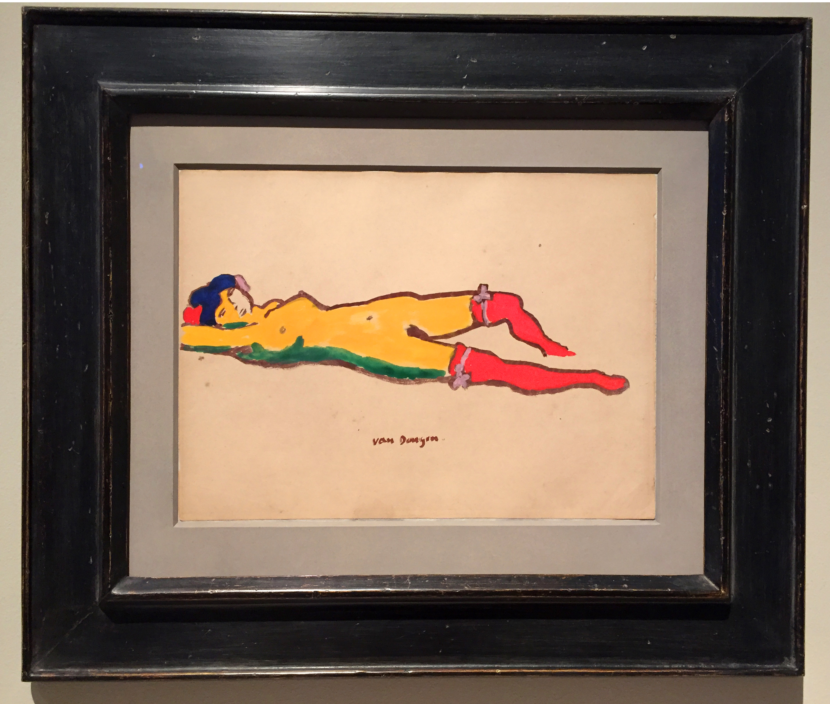 The Fauvist works Kees Van Dongen produced during the five years between 1905 and 1910 are generally considered to be the finest of his career. By 1904, as Fred Leeman has noted, ‘Van Dongen began to apply the bold lines and rough daubs of bright “unnatural” color, as first developed in his works on paper, to his paintings.’ Characterized by an undeniable eroticism, this vibrantly coloured gouache drawing is closely related to an oil painting by Van Dongen of the same subject dating to c.1906-1907, which recently appeared at auction and is today in a private collection. Both the painting and the present gouache were executed at the height of Van Dongen’s association with the Fauves, when he began working from a studio near the Folies-Bergère. The artist’s fascination with sultry cabaret dancers and performers, as well as the local brothels and prostitutes, is reflected in much of his work of this period. Here the model is posed as a classical reclining nude, but with the distinctly modern touch of bright red stockings that serves to accentuate her identification as a Parisian demimondaine.
