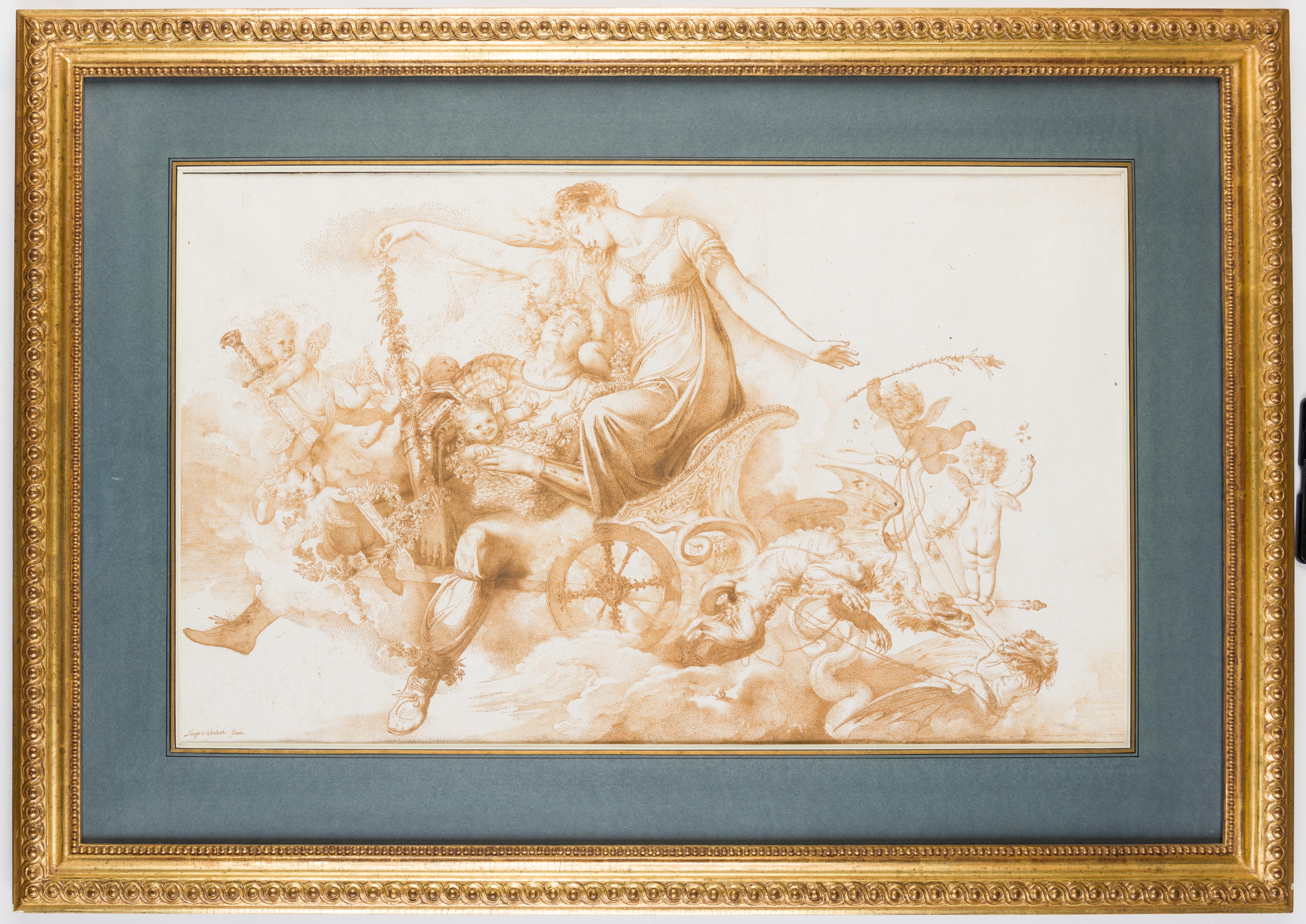 This impressive drawing of Rinaldo and Armida on a Chariot drawn by Dragons has, indeed, much in common with a series of large and highly finished pen drawings commissioned from the artist by Tommaso Puccini. An erudite connoisseur, Puccini seems to have had a particular penchant for dramatic and visionary scenes from literature, and encouraged Sabatelli to treat such themes in his work. Several very large pen drawings made by Sabatelli for Puccini are today in the collection of the Uffizi, including Philopoemen Kills Machanidas, signed and dated 1793, and two versions of Athenodorus and the Ghost. Among other comparable drawings of similar size and technique by Sabatelli are The Madness of Orlando in the Philadelphia Museum of Art, which, like the present sheet, was once in the Capponi collection in Florence, and several works in private collections, including two large pen and ink drawings of Dido Abandoned and Dante Conversing with Farinata degli Uberti.