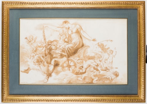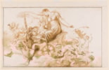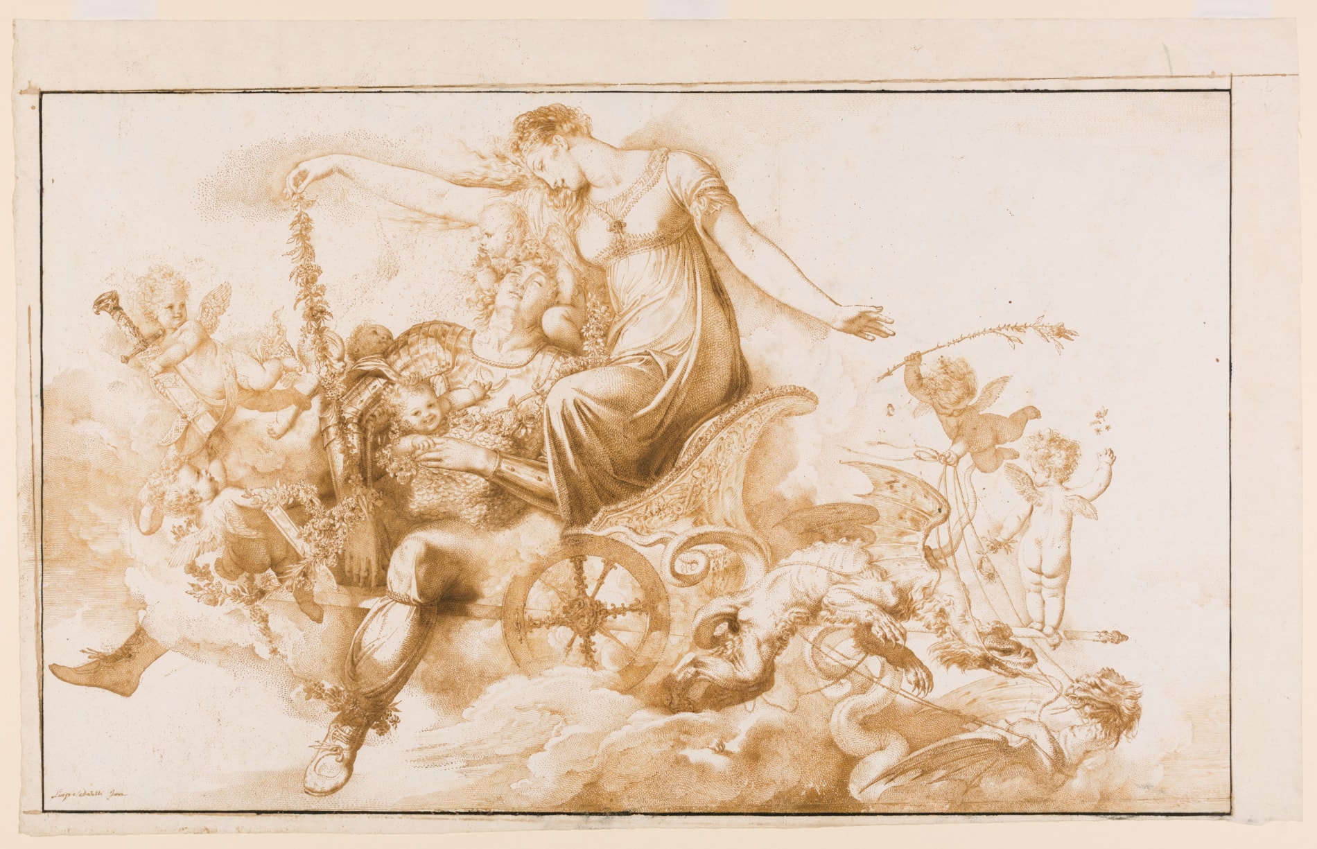 A superb example of the vigour of Luigi Sabatelli’s pen draughtsmanship, and what has been aptly described as the artist’s ‘virtuoso calligraphy’, this very large drawing may be dated to the artist’s years in Rome, between 1789 and 1794, and in particular towards the end of that period. The subject is taken from Canto XIV of the 16th century epic poem Gerusalemme Liberata by Torquato Tasso, and depicts the abduction of the Christian knight Rinaldo by the sorceress Armida. Rinaldo, having fallen asleep under Armida’s magic spell, and bound with a chain of roses, lilies and woodbines, is taken in her chariot to her palace on the Island of the Fortunate. It is interesting to note that Sabatelli has here shown the chariot drawn by dragons, in keeping with Tasso’s original text, instead of the horses found in almost all depictions of this theme in Italian art. Indeed, the striking and original conception of the creatures is typical of the inventiveness and imagination common to much of Sabatelli’s work. Despite the popularity of Tasso’s epic poem among artists, the theme of the abduction of Rinaldo by Armida in her chariot is rare in Italian art, and Sabatelli may have taken inspiration for the composition of this drawing from Guercino’s ceiling fresco of the same subject, painted in c.1621, in the Palazzo Costaguti in Rome.