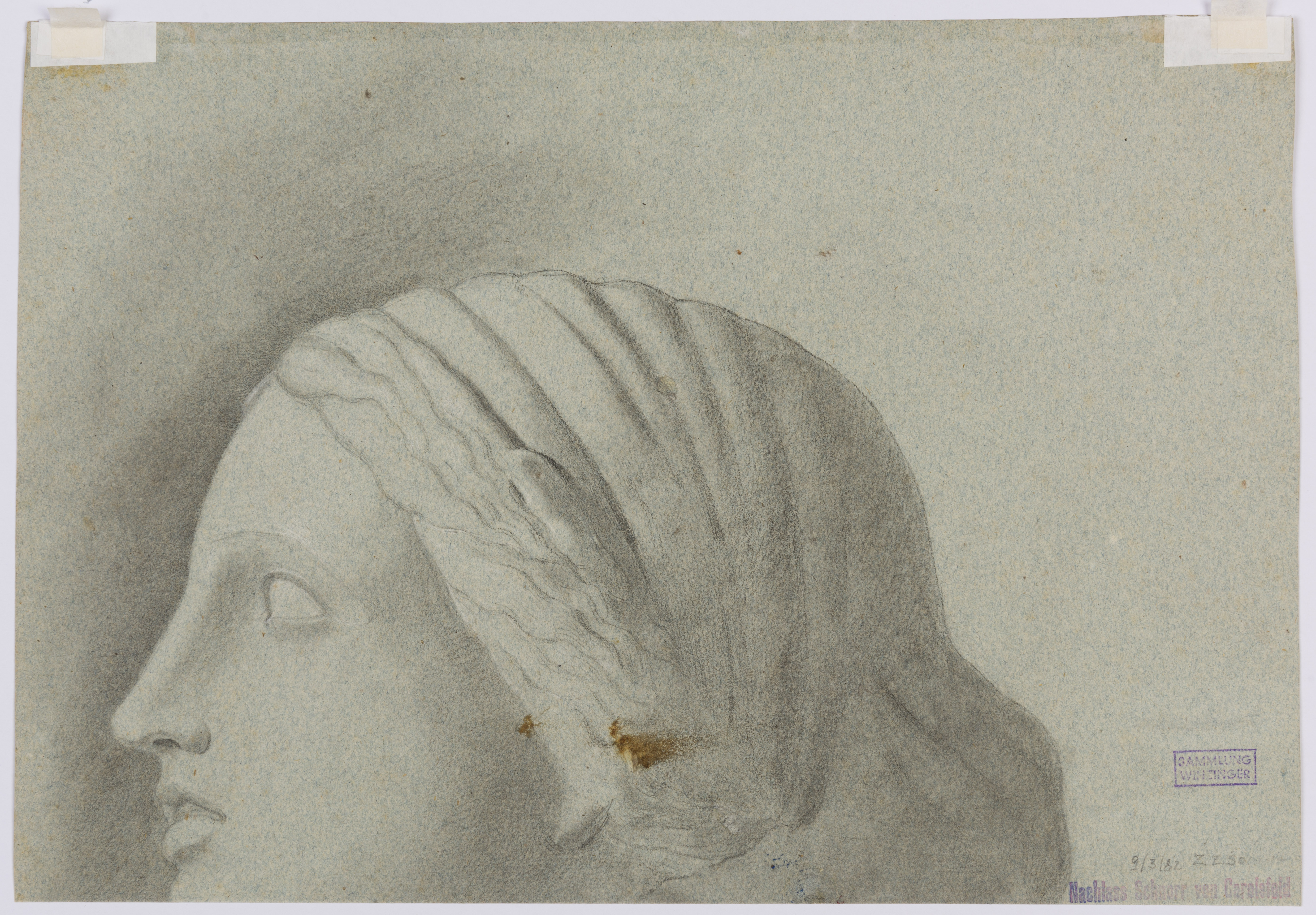 A partial study of the head of a woman after an antique drawn in black chalk on the verso.