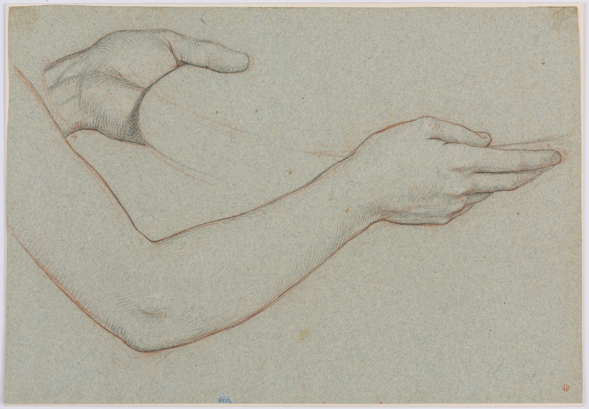 This drawing is a preliminary study for the arm and hands of the young boy bringing a plate of fish to Jesus, at the centre of the monumental mural of The Feeding of the Five Thousand painted by Ludwig Schnorr von Carolsfeld in 1839 for the refectory of the Armenian Catholic Mekhitarist Monastery in Vienna. Painted on canvas and, at six metres in width, spanning the entire end wall of the refectory, the painting is one of the most significant Nazarene works of the 19th century in Austria.
