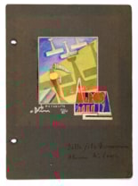 This watercolour is pasted down onto what appears to be the cover of a small notebook with black pages. It is part of a series of small-scale watercolours of aeronautical subjects, drawn between 1931 and 1932, with such titles as Stormo, Aeronautica, Volo, Sintesi atmosferica, Eliche, Squadriglia veloce – Volo, Aeroporto and Madonna dell’aria. Most of these watercolours, including the three sheets here exhibited, appear to have been originally part of the same notebook.