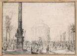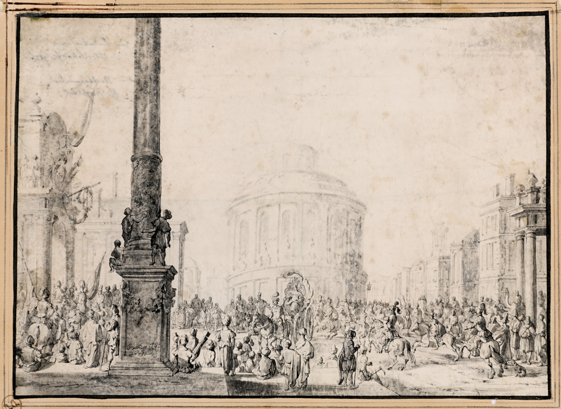 An especially refined example of Jacob van der Ulft’s draughtsmanship, this highly finished drawing - prominently signed and dated in full by the artist - was almost certainly intended as an autonomous work of art for sale. As Michiel Plomp has noted, ‘Jacob van der Ulft produced many drawings and paintings of festive processions in imaginary ancient cities...It is not always clear whether Van der Ulft meant to depict actual historical facts.’ A particular comparison may be made with a number of other drawings similarly crowded with figures, including a large drawing of Anthony and Cleopatra in the Louvre and a Procession in an Imaginary Classical City in the Teylers Museum in Haarlem, as well as a drawing of A Roman Street with Figures in the Kupferstichkabinett in Berlin and a drawing of The Flagellation in the Pierpont Morgan Library in New York. Also similar, although somewhat less finished, is a drawing of an Italianate town with a church alongside a round temple or mosque, signed and dated 1666, in the Louvre.