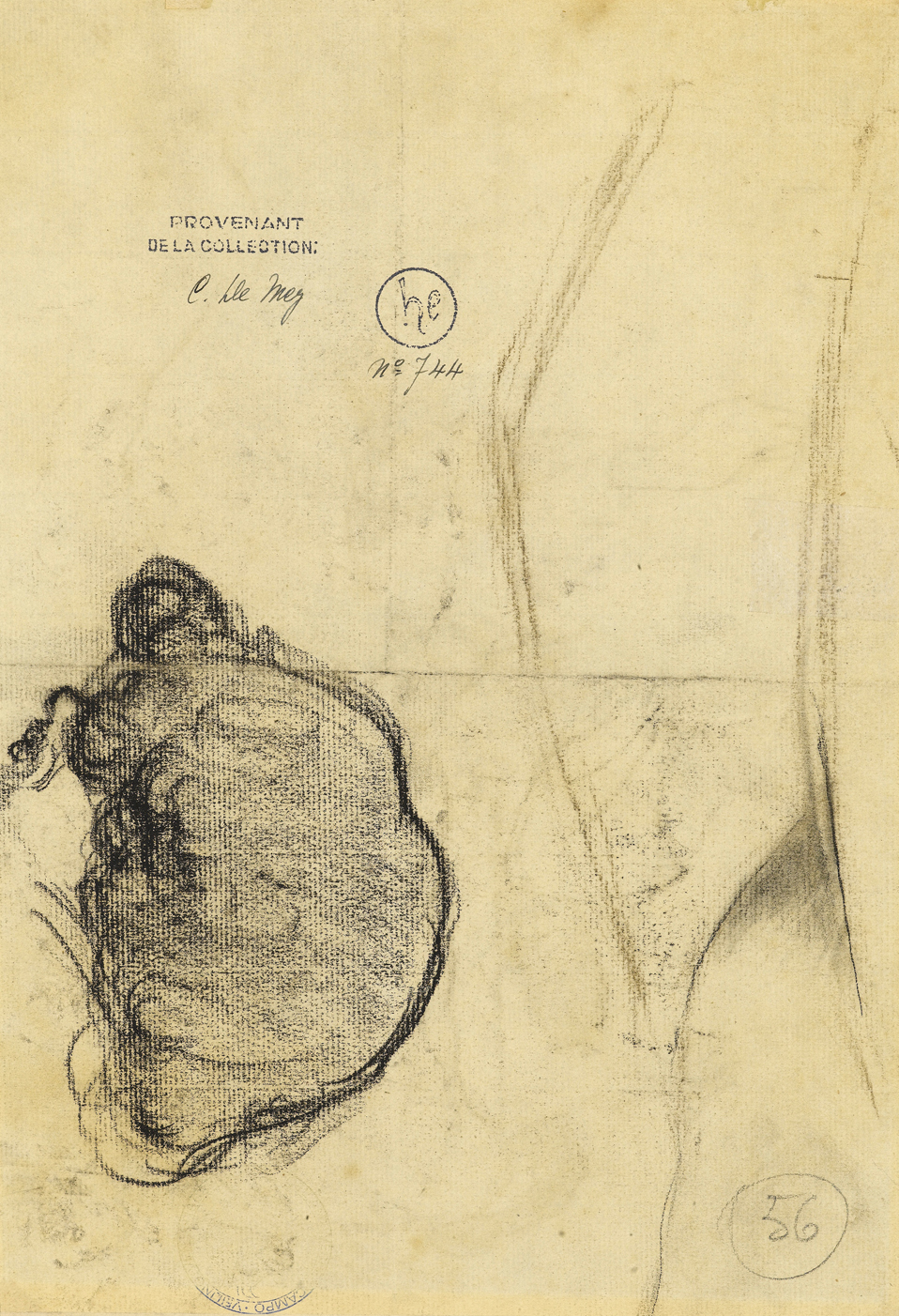 A study of the top half of the head of a man, seen from behind, drawn in charcoal on the verso.