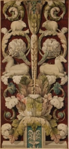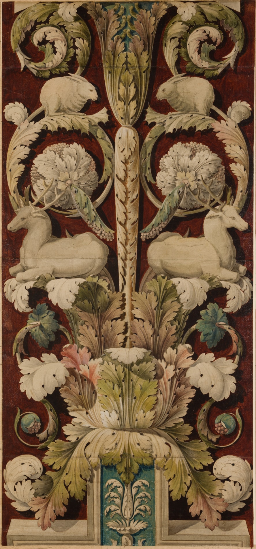 The combination of paired deers and hares in this very large watercolour, which is almost certainly to be dated to Albertolli’s Lombard period, would suggest that it may have been intended for a decoration in a hunting lodge. The drawing is stylistically and thematically similar to the first plate in Albertolli’s Ornamenti diversi inventati e disegnati da Giacondo Albertolli professore di ornate nella Reale Accademia di Belle Arti in Milano; a collection of engravings after the artist’s stucco designs, published in 1782.