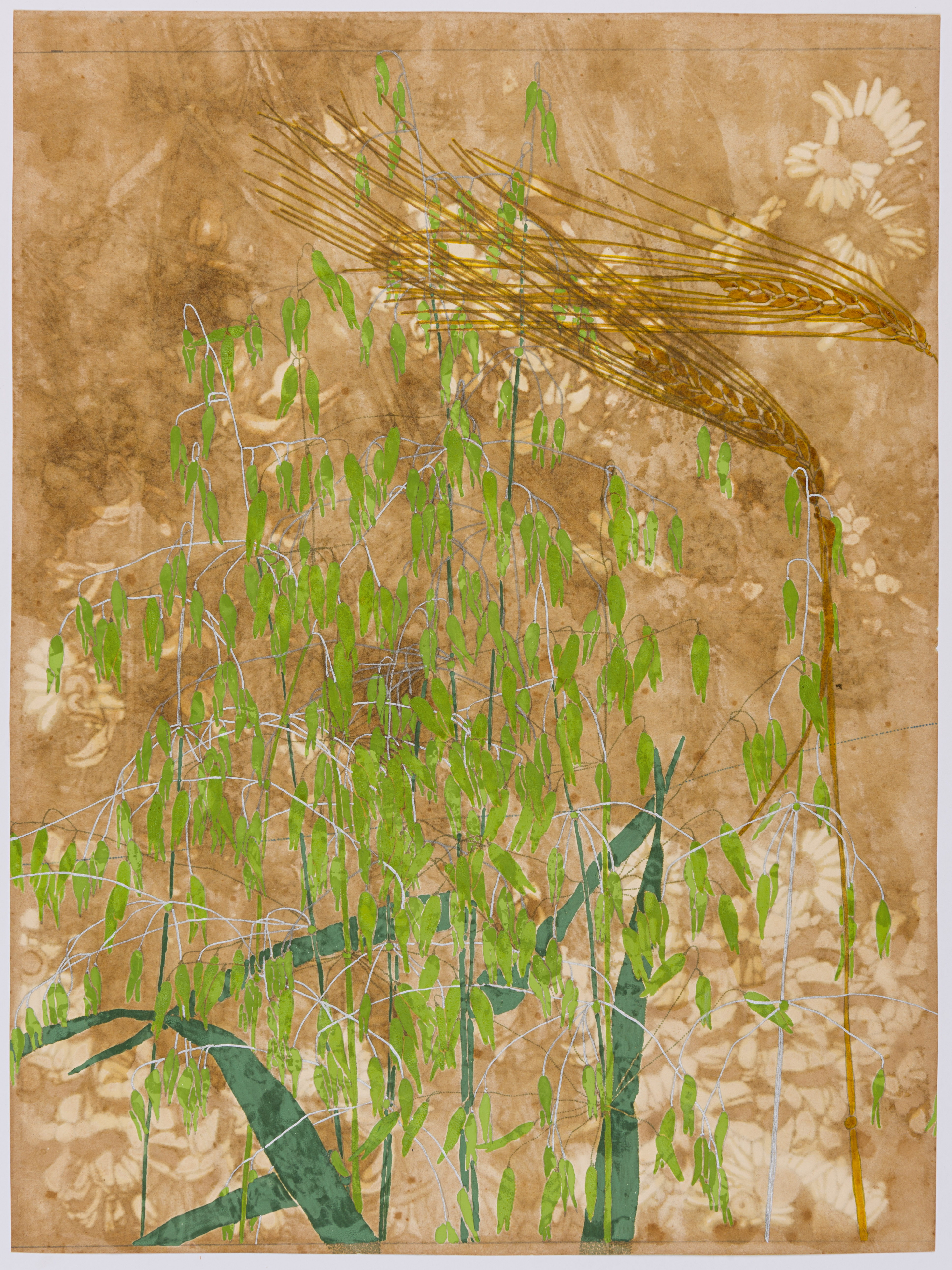 Gouache, watercolour and pencil on paper, with a drawn border in green watercolour.