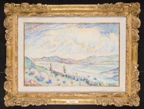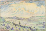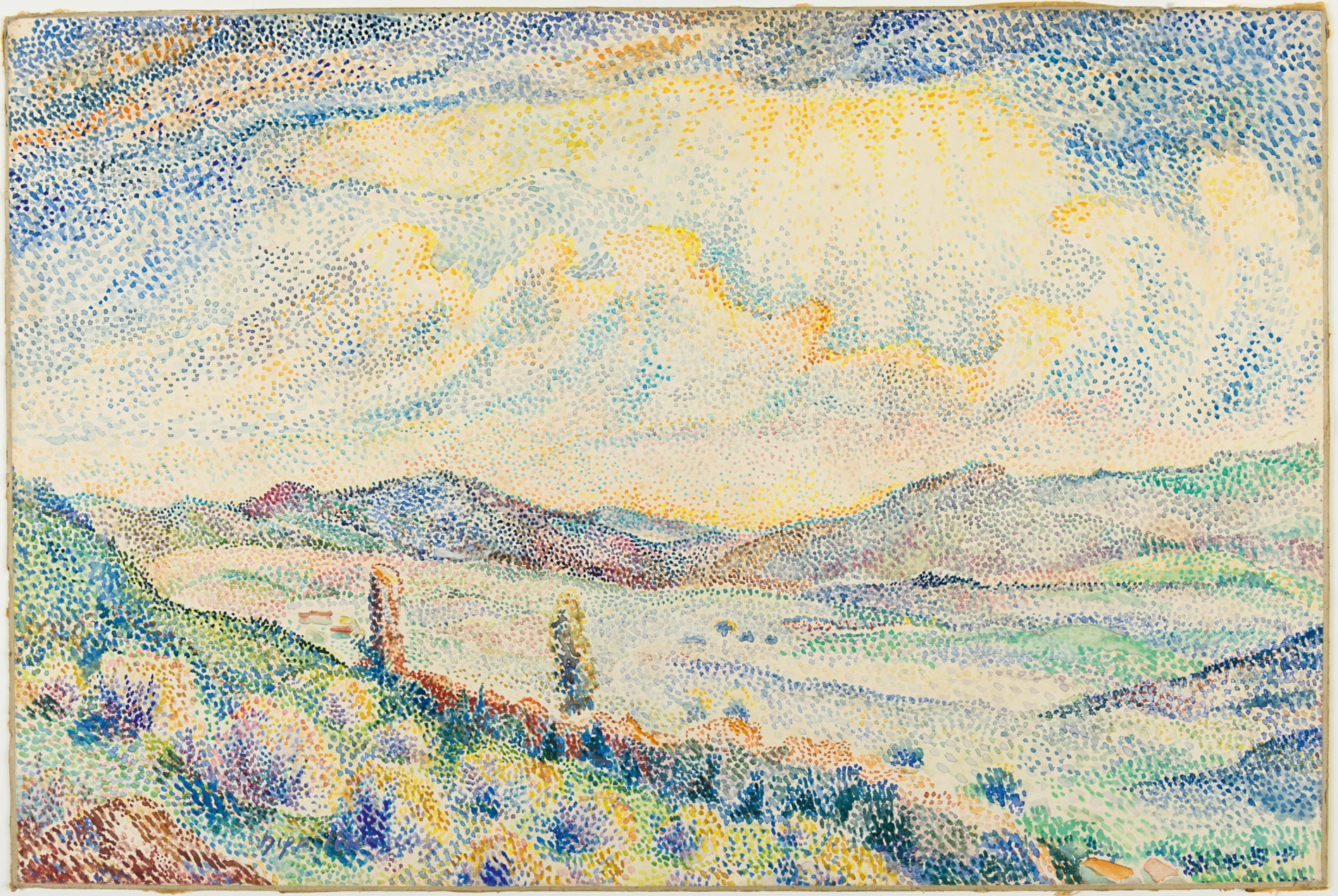 Arguably Hippolyte Petitjean’s most distinctive and original contribution as a Neo-Impressionist artist are his vibrant pointillist watercolours, of which the present sheet is a particularly fine example. Approximately two hundred watercolours by the artist are known, many of which were made as independent works of art to be sold to collectors. As one modern scholar has noted, ‘As with most of [Petitjean’s] works, his watercolors are not dated, nor are their locations identified. In executing them, he employed the divided color technique very freely, applying dabs of color in a loose network that allows the white of the paper to show through...in his pure landscapes the artist takes a more individual approach, subtly modulating the different areas of color to suggest gradual spatial recession or the light effects of a setting sun.’ From around 1912 onwards, Petitjean’s watercolours are characterized by more widely spaced dots of pure colour, in which the surface of the paper shows through.