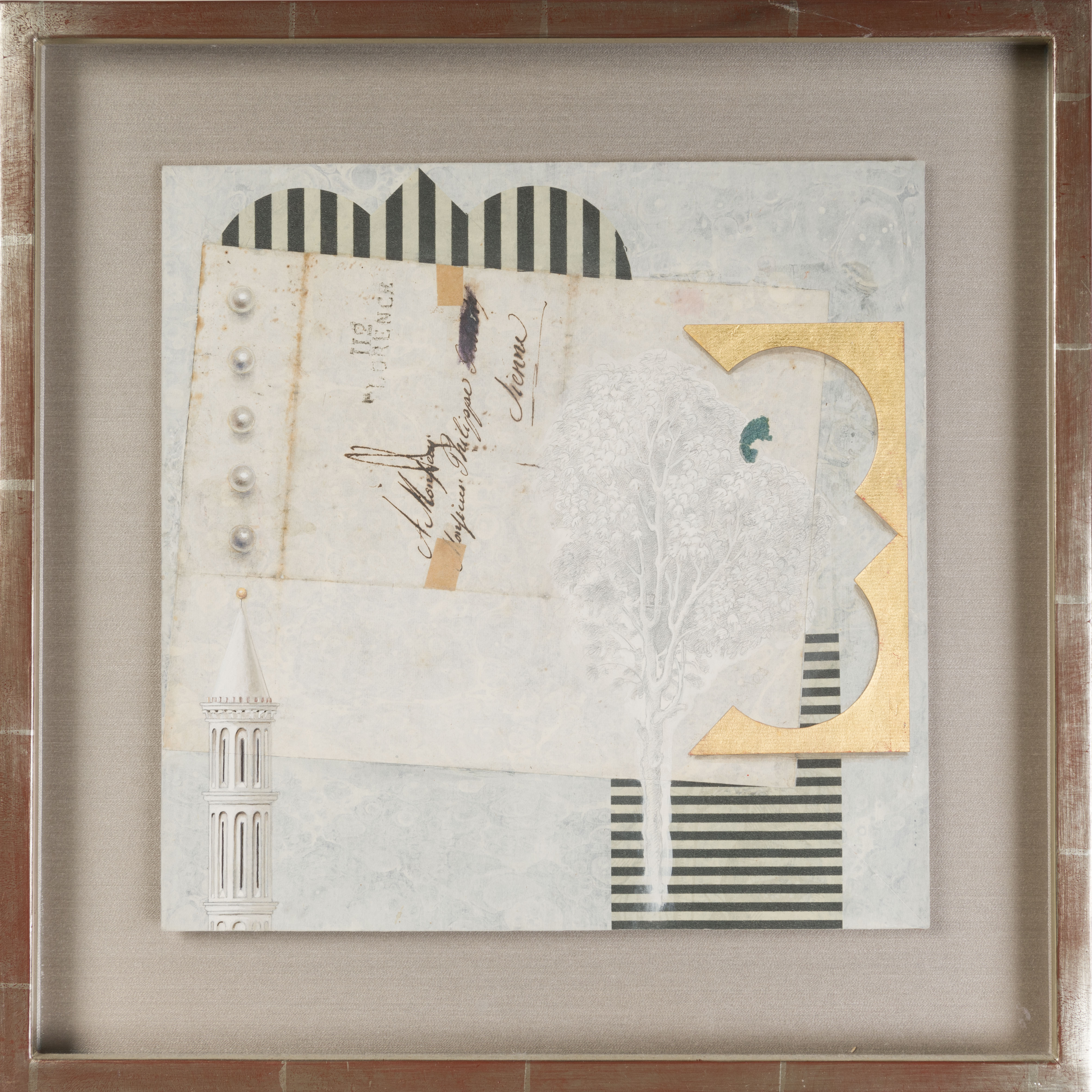 'Meticulous precision is a quality often associated with the machine age, but an equally exact manual execution reached and passed its apotheosis long before the first steam engine met its track. Such sharp perfection, born of infinite patience, relates to a time when creativity was not strongly associated with chaos, as it is in modern psychodynamic thought. Though Anne Connell’s exquisite paintings draw on this old-fashioned idea of ingenious order, and though they incorporate elements of specific antique paintings that the artist admires, they are neither post-modernist nor appropriationist, because their purpose is neither to comment on the transience of history nor to reflect the fallacy of authorship. Their impact is visual rather than conceptual, but they contain a wistful philosophy; they suggest a continuity that encompasses the continuity of loss. Though they are sometimes playful, they are also mystical. That shimmering, smooth surface, the decorative elements that rise sensually from the picture plane, the elegant fragments that seem almost flirtatiously to ask why and how they were selected, all seduce without giving away their secrets. You see at once that the work is beautiful, but you can tell that it is not simply about its own beauty.