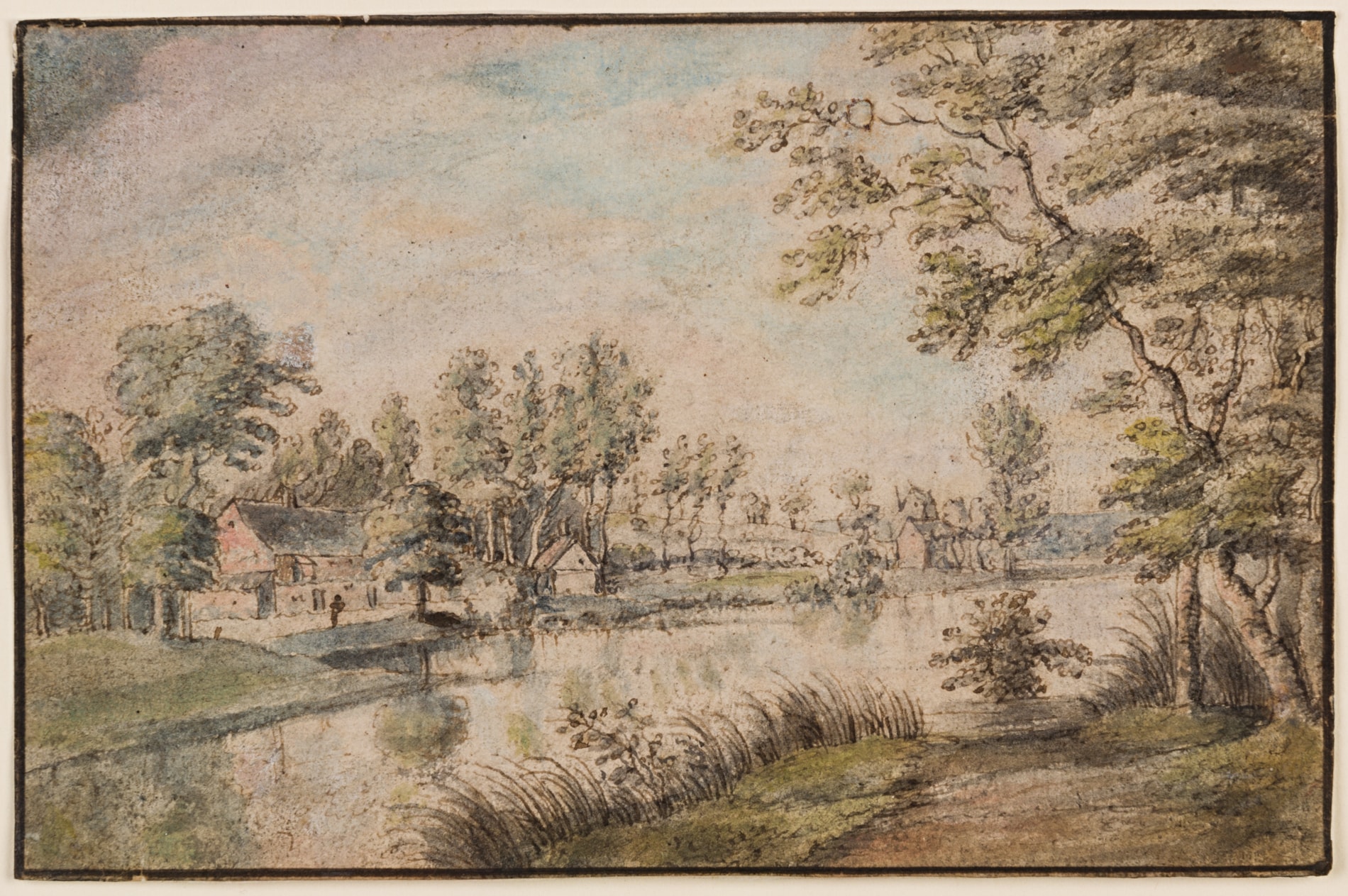 The present sheet is a fine example of the landscape studies for which Lucas van Uden was known, and the combination of delicate pen and ink lines with touches of watercolour is a characteristic feature of the artist’s draughtsmanship. As one scholar has noted, ‘In his many water-colour drawings Van Uden often achieved a refinement and a certain tenderness that are not always present in his paintings; it is as though he could express himself better in smaller works. The drawings give a good picture of the flat Flemish country and the wooded fringes of Wallonia. Water often plays an important part in his compositions. It is questionable whether the drawings were made direct from nature; they seem rather to have been conceived as ‘finished’ studio pieces based on sketches made out of doors in chalk or with the pen.’