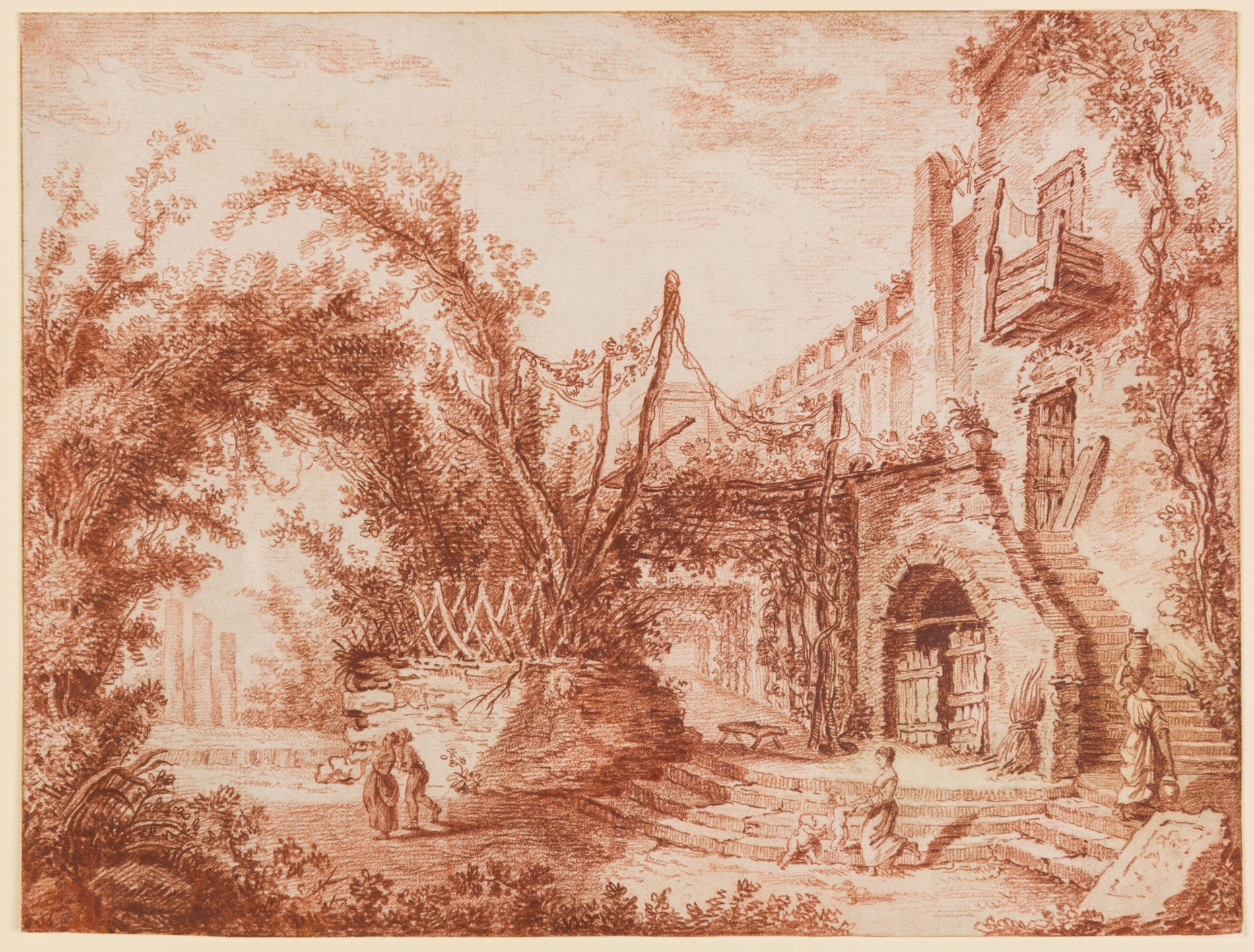 The present sheet is attributed to Pierre-Adrien Pâris, who made several first-rate drawn copies after the Italian landscape drawings of both Robert and Fragonard. The composition of the present sheet is derived from a slightly larger red chalk drawing of the so-called ‘Temple of Jupiter Serapis’ at Pozzuoli by Hubert Robert, today in a private collection. (A variant of the composition by Robert is in the collection of the Albertina in Vienna.) Robert’s drawing can be dated to 1760, when he and the Abbé de Saint-Non travelled together to Naples to prepare the illustrations for the Voyage pittoresque, ou description historique des royaumes de Naples, et de Sicile. The related engraving in the book is by Charles Guttemberg.