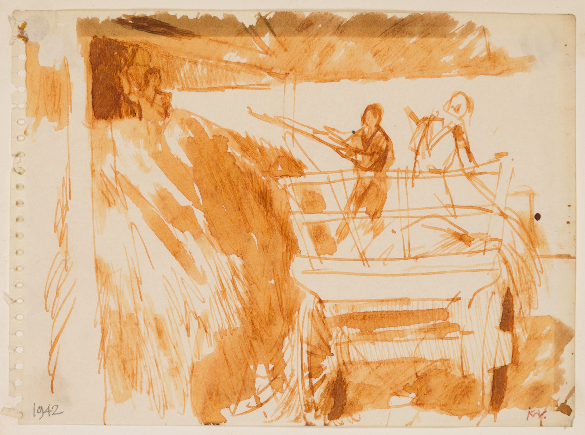 A stylistically comparable drawing of soldiers raising a tent, of the same date and probably from the same small sketchbook, was formerly in the Tim Ellis collection and was sold at auction in London in 2014. What may be the sketchbook itself, or a similar one, used at Codford in the summer of 1942 and containing fourteen leaves, was acquired from the artist by his friend Klaus Peter Adam and recently appeared at auction.