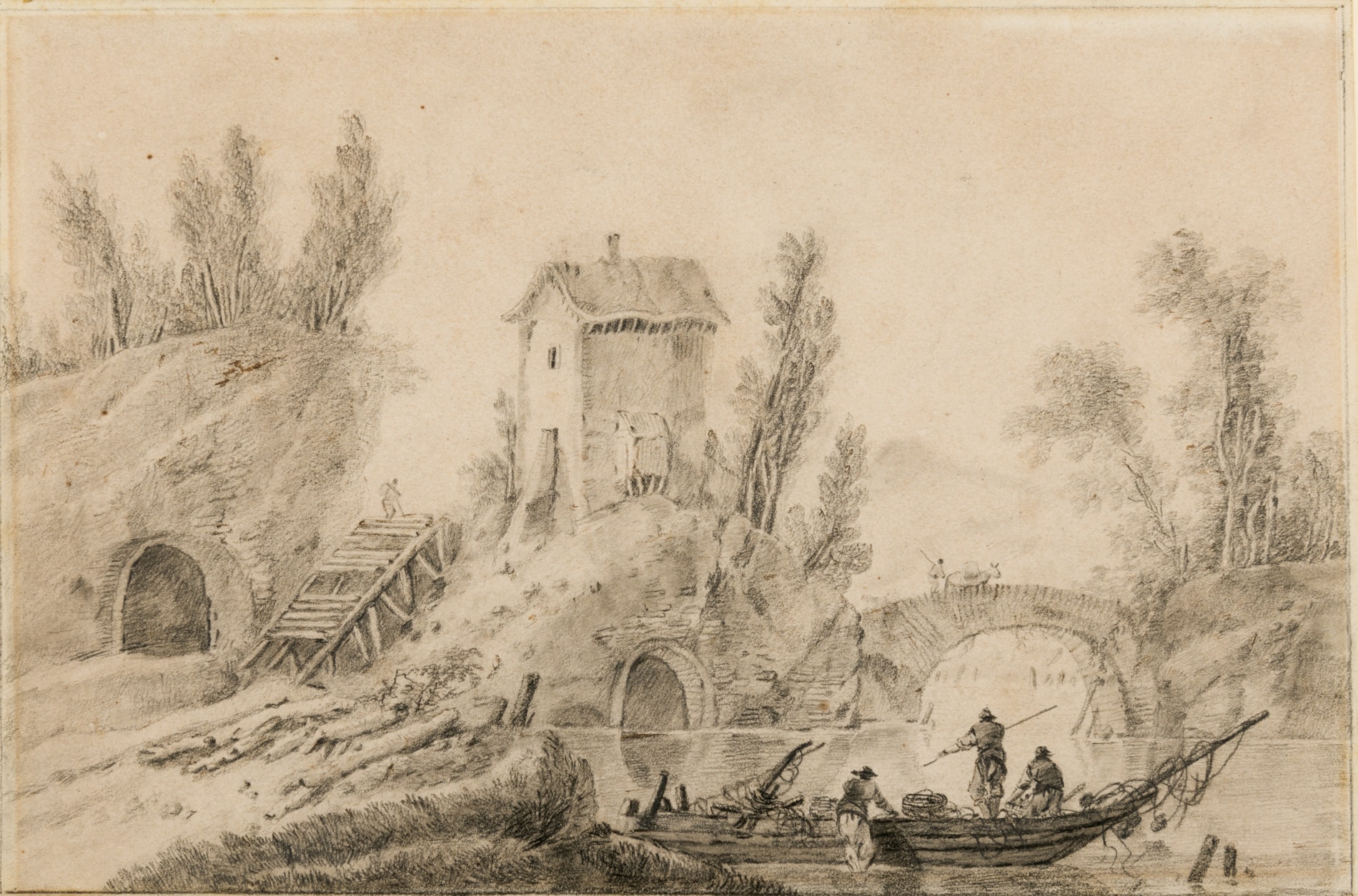Fishermen by a Mill and an Arched Bridge