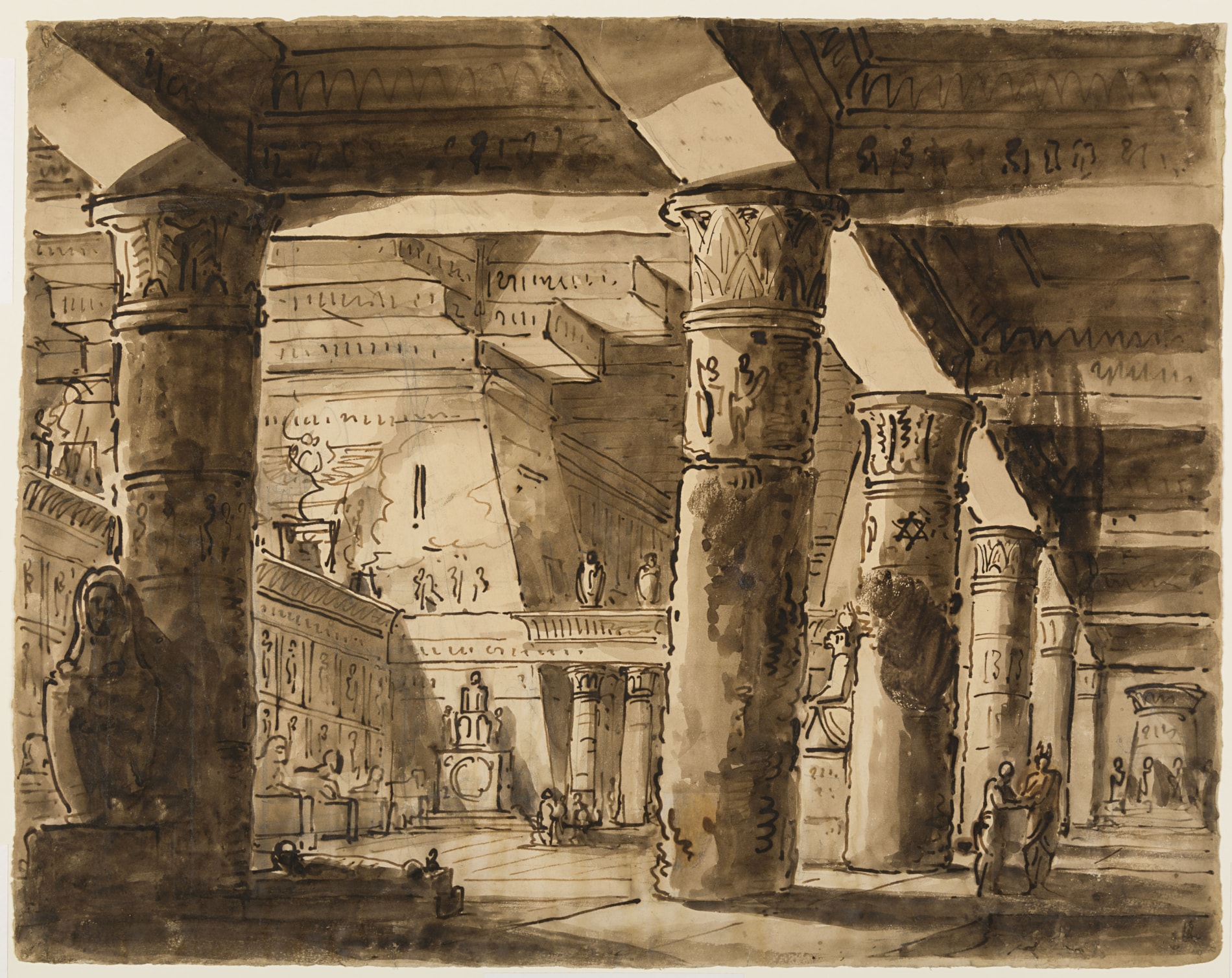 As the inscription on the verso of the present sheet notes, this large drawing was made by Basoli as a means of amusing his friends, on the 14th of March 1824, in the home of a certain Caterina Lipparini. (Caterina Lipparini may have been a relation of the Bolognese painter Lodovico Lipparini, who painted a portrait of Basoli in c.1824, the same year this drawing was made.) Before he started drawing in front of his audience, the sheet of paper had already been stained by two large ink splotches. The artist then proceeded to create this dramatic imaginary view of the interior of an Egyptian temple, cleverly incorporating the ink blots into his design.