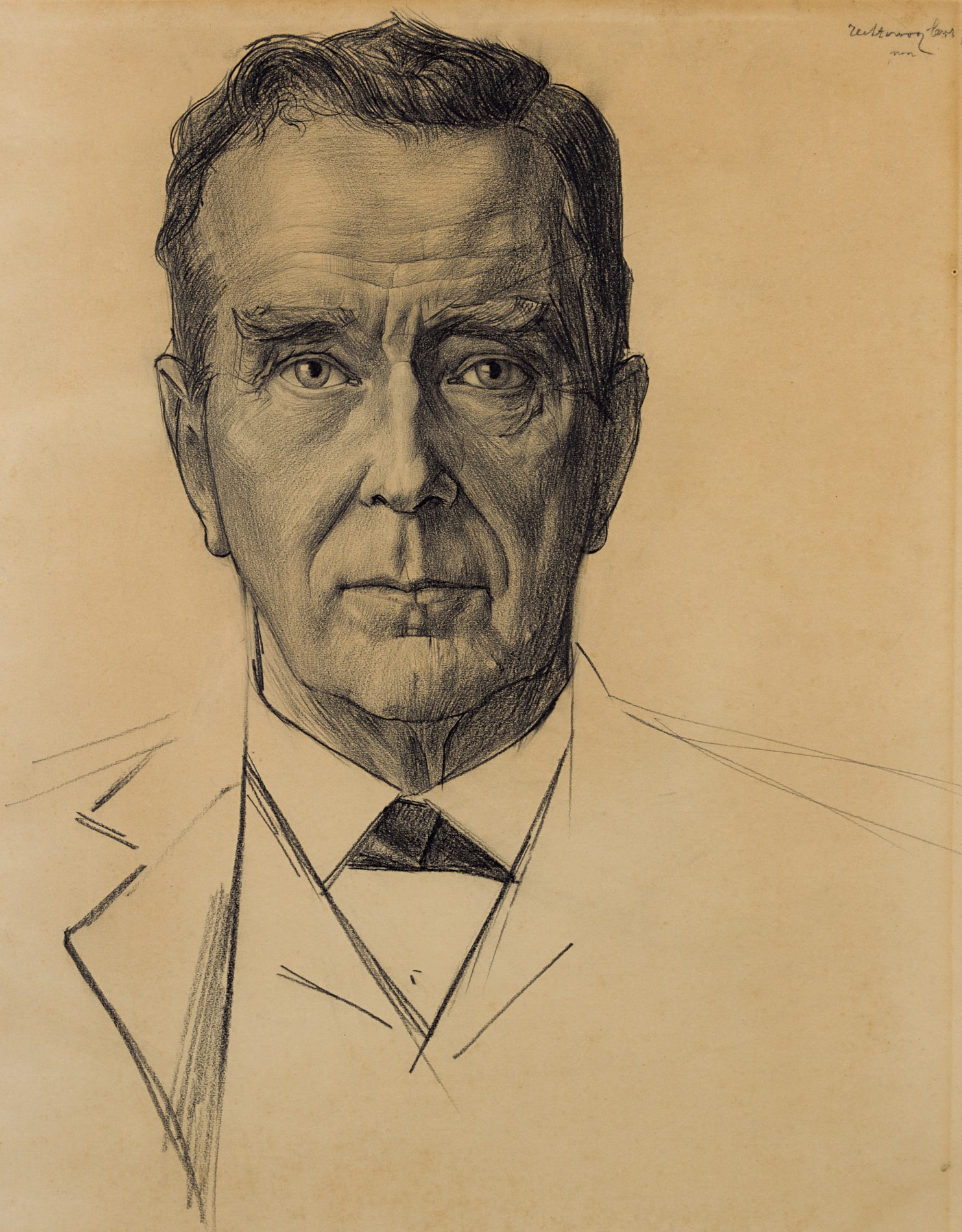 Beginning in the early years of the 20th century, at around the time of his conversion to Catholicism, Toorop painted and drew a number of striking portraits of priests and clergymen. He was particularly active in this regard during the years between 1910 and 1913, when he produced several arresting portraits of Jesuits at the Canisius College in Nijmegen. (It should be noted, however, that during the years in The Hague which found him most active as a painter of religious subjects for churches, he painted very few portraits of clerics.) Toorop’s avowed Catholicism did not, however, prevent him from making portraits of Protestant clergymen, of which the present sheet is a particularly fine example.