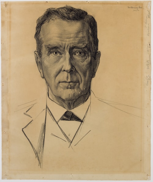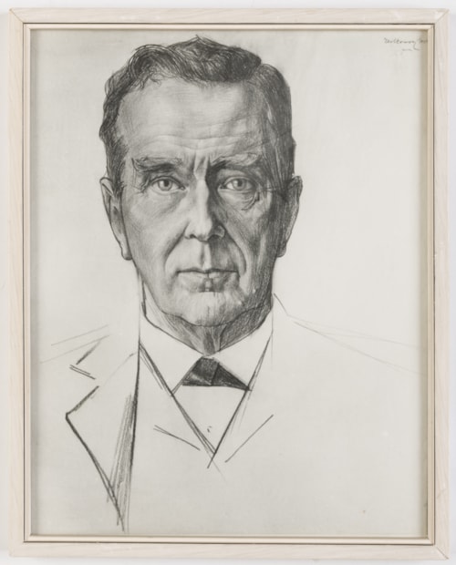 This large pencil portrait of Dr. Jan Lodewijk Heldring (1852-1923), a pastor and member of the Dutch Reformed Church in Amsterdam, is typical of Toorop’s portraiture in its precise and direct treatment of the head of the sitter. In many of his large-scale portrait drawings, the artist preferred to depict his subjects full face and head-on, seemingly in direct confrontation with the viewer. This large drawing has remained in the sitter’s family until recently, having passed by descent to Heldring’s grandson, Ranulph Bye (1916-2003), an American artist and writer.