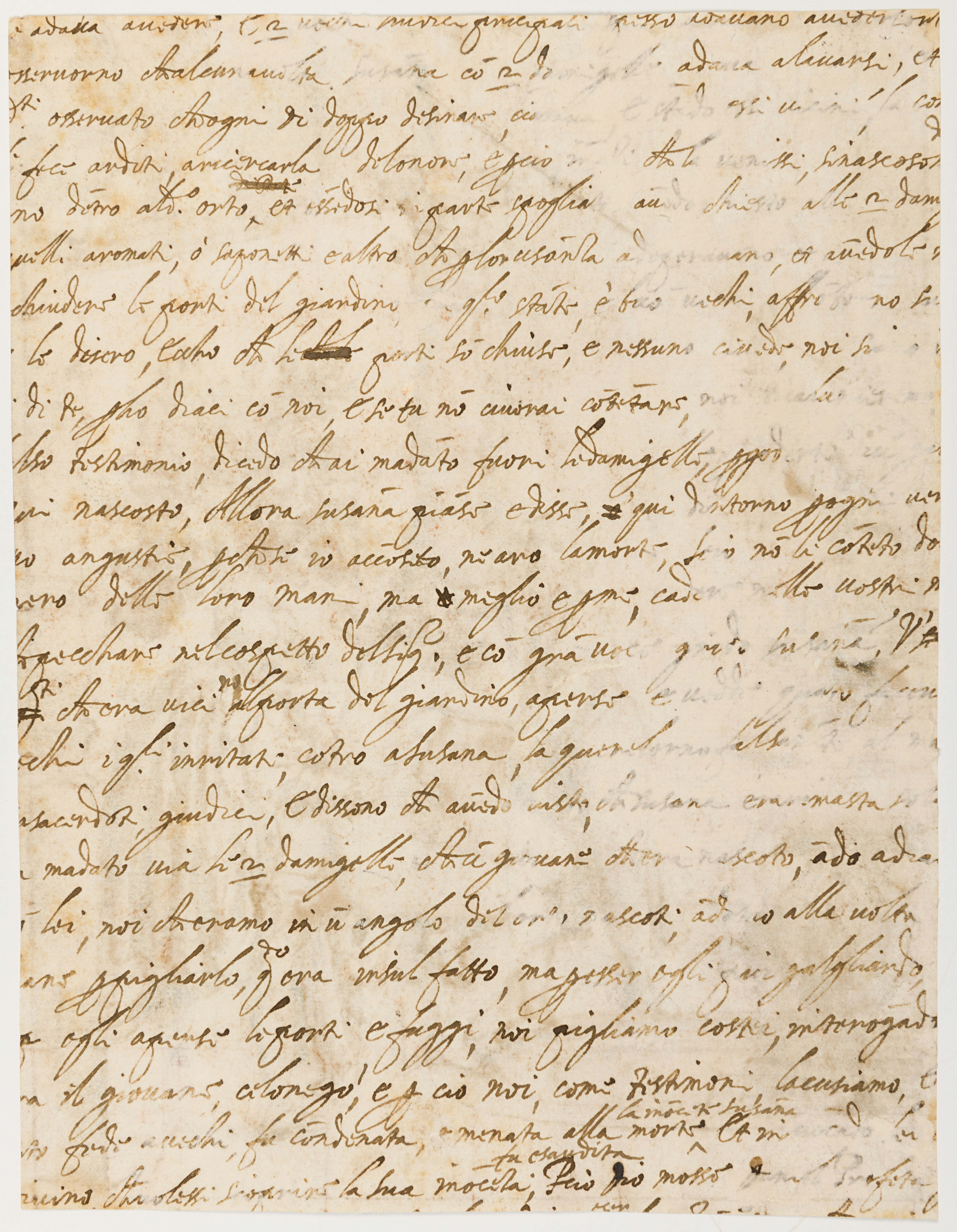 Although squared for transfer, the present sheet cannot be related to any surviving painting or fresco by Coccapani. Elisa Acanfora has dated this drawing to the early 1620s and has further noted some correspondence with Coccapani’s painting of The Toilet of Bathsheba in a Florentine private collection, which is set in a similar loggia and includes the same fountain with a putto holding a dolphin that is seen at the left of the present sheet. Miles Chappell has likened this drawing stylistically to a drawing of The Assumption of the Virgin of c.1612 in a private collection and also notes the two old men are similar to those in a drawing of Figures Meeting at the Entrance to a Cityin the Louvre. He has further recently pointed out that the letter on the verso of the present sheet is in Coccapani’s hand and, at least in part, seems to relate to the subject of the drawing on the recto.