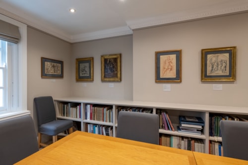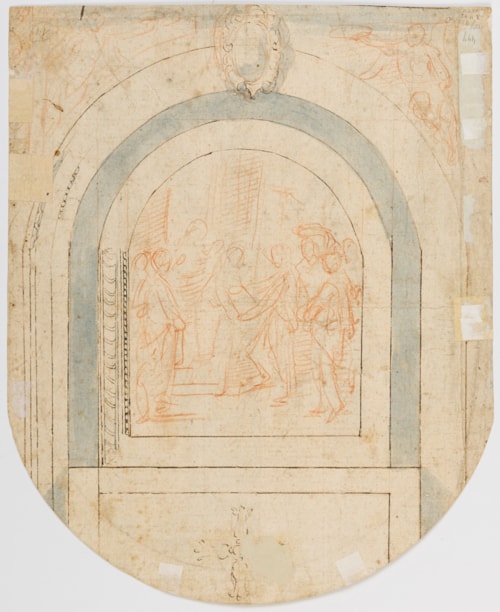 The verso of the present sheet contains a rapid sketch in red chalk of the composition of the Visitation on the recto, together with a rough design for the surrounding frame for the altarpiece, with its arched top. The verso also shows Balducci’s sketch for the decoration of the chapel façade in which his painting was to be placed, to be surmounted by a coat of arms - presumably that of the donor of the chapel or the altarpiece itself – flanked by spandrels with winged angels.
