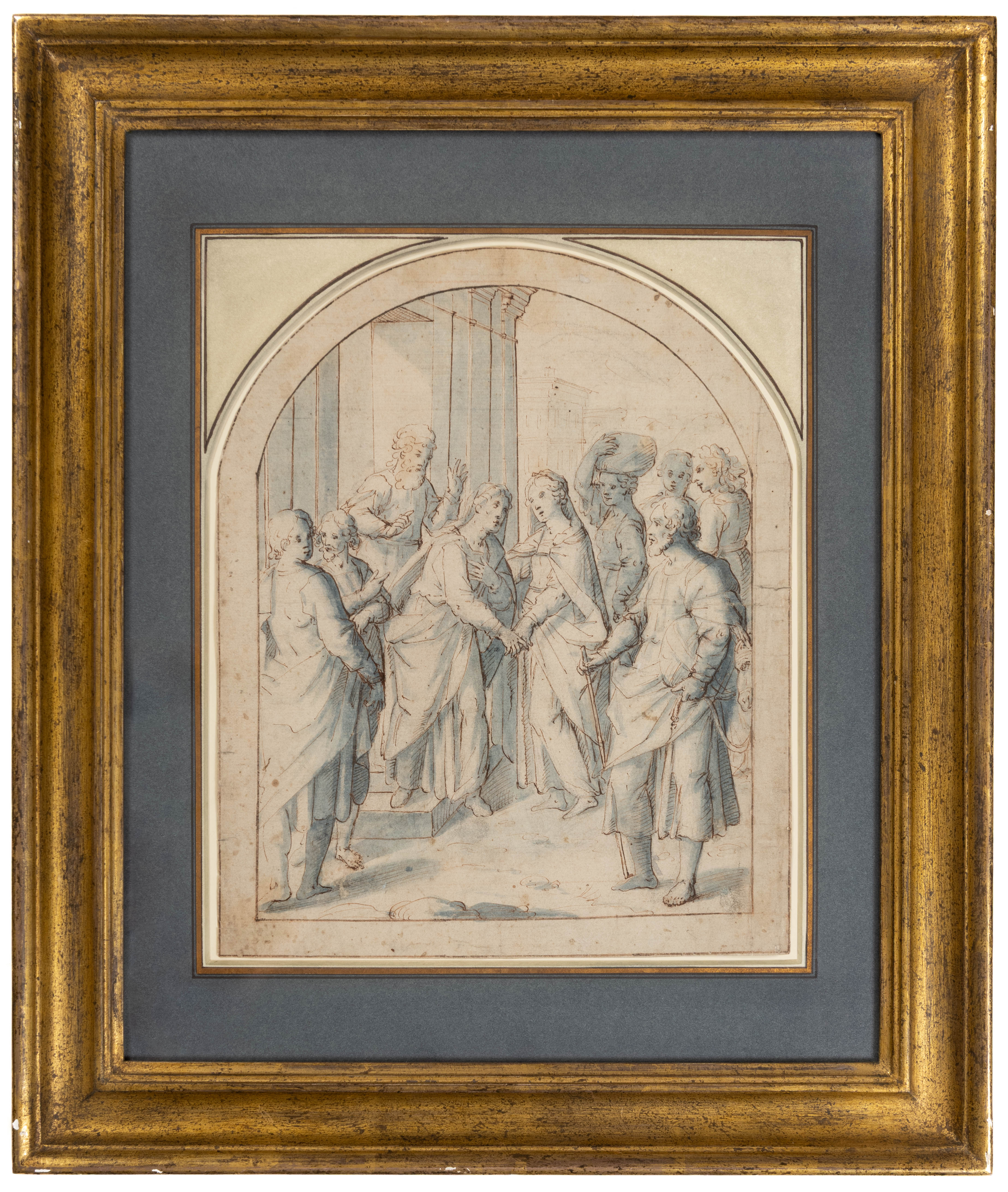 The verso of the present sheet contains a rapid sketch in red chalk of the composition of the Visitation on the recto, together with a rough design for the surrounding frame for the altarpiece, with its arched top. The verso also shows Balducci’s sketch for the decoration of the chapel façade in which his painting was to be placed, to be surmounted by a coat of arms - presumably that of the donor of the chapel or the altarpiece itself – flanked by spandrels with winged angels.