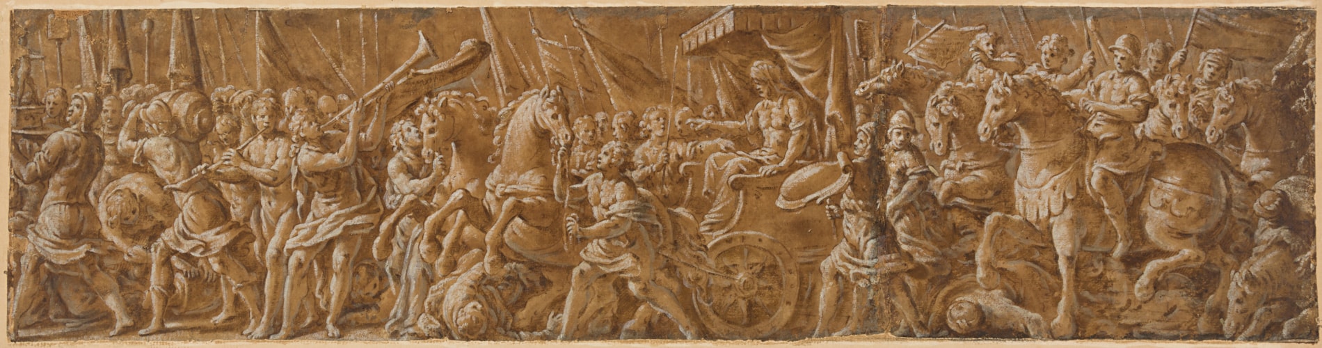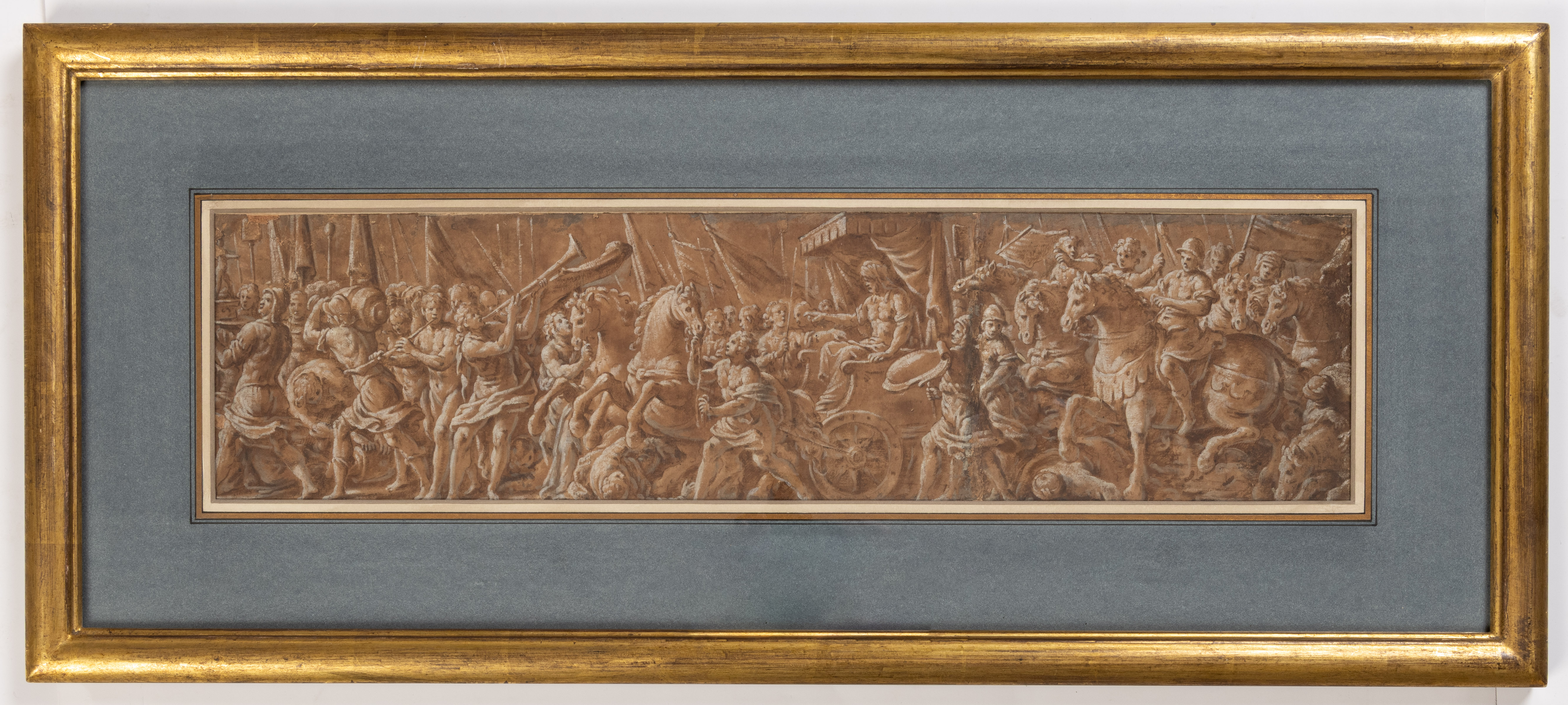 This is one of a pair of processional scenes, which appear to form a continuous narrative composition. They may be likened on stylistic grounds to several of the large group of more than twenty drawings by Bassetti in the Royal Library at Windsor Castle. This drawing is, in particular, of similar dimensions and almost identical composition to a frieze-like drawing of The Triumph of Caesar at Windsor. The composition of the Windsor drawing ends somewhat abruptly at the left edge, and it has been suggested that the scene may have been continued on another, separate sheet, now lost. Also similar in format is a drawing of a Battle Scene by Bassetti at Windsor, which, like The Triumph of Caesar, was probably acquired with the collection of Consul Joseph Smith by King George III in 1762.