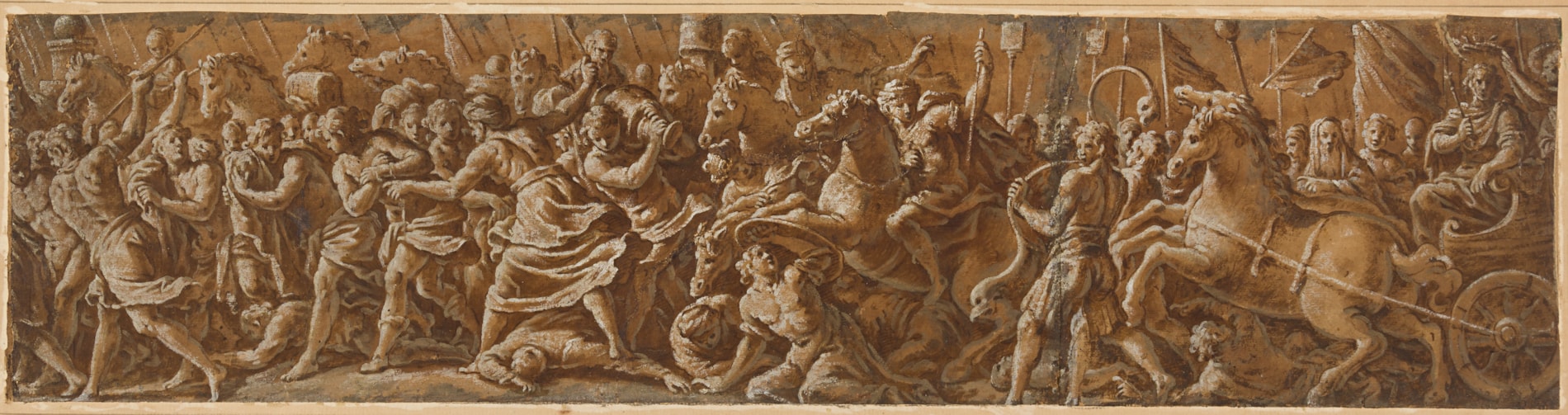 This pair of processional scenes, which appear to form a continuous narrative composition, may be likened on stylistic grounds to several of the large group of more than twenty drawings by Bassetti in the Royal Library at Windsor Castle, and in particular a frieze-like drawing of The Triumph of Caesar of similar dimensions. The composition of the Windsor drawing ends somewhat abruptly at the left edge, and it has been suggested that the scene may have been continued on another, separate sheet, now lost. Also similar in format is a drawing of a Battle Scene by Bassetti at Windsor, which, like The Triumph of Caesar, was probably acquired with the collection of Consul Joseph Smith by King George III in 1762.