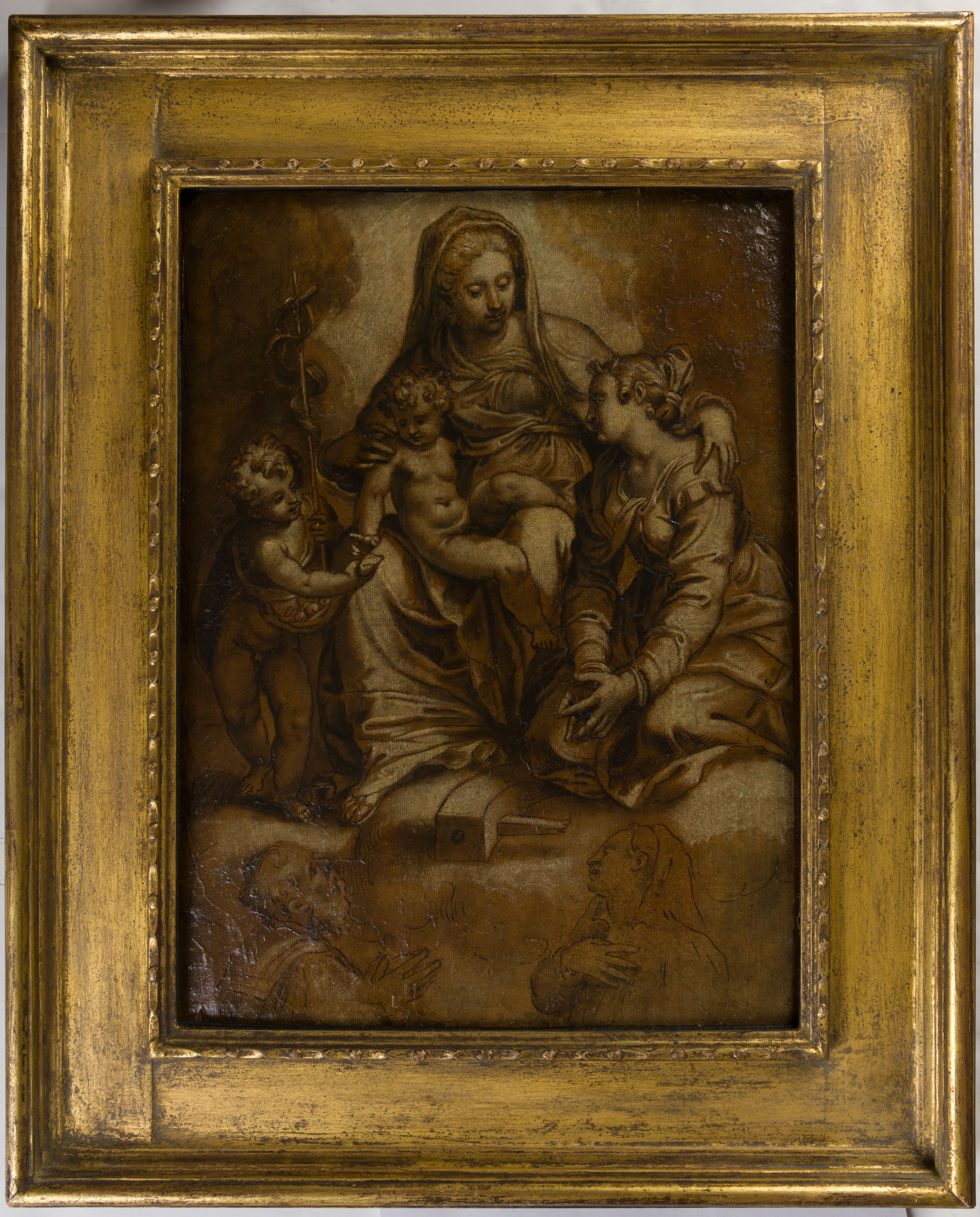 As Diana Gisolfi has noted, ‘Drawings form a significant part of Farinati’s oeuvre, especially his numerous chiaroscuro drawings on tinted paper, which were often used as modelli.’ The present sheet is likely to be a study for the type of devotional easel picture, sometimes painted on copper or slate, that Paolo Farinati produced for private patrons throughout his career. An interesting feature is the contrast between the highly finished nature of the main part of the composition and the more summary treatment of the donor figures at the bottom of the sheet. Although this large drawing cannot be related to any surviving work by Farinati, some compositional similarities may be noted with a late altarpiece of The Mystic Marriage of Saint Catherine, signed and dated 1603, in the Museo del Castelvecchio in Verona.