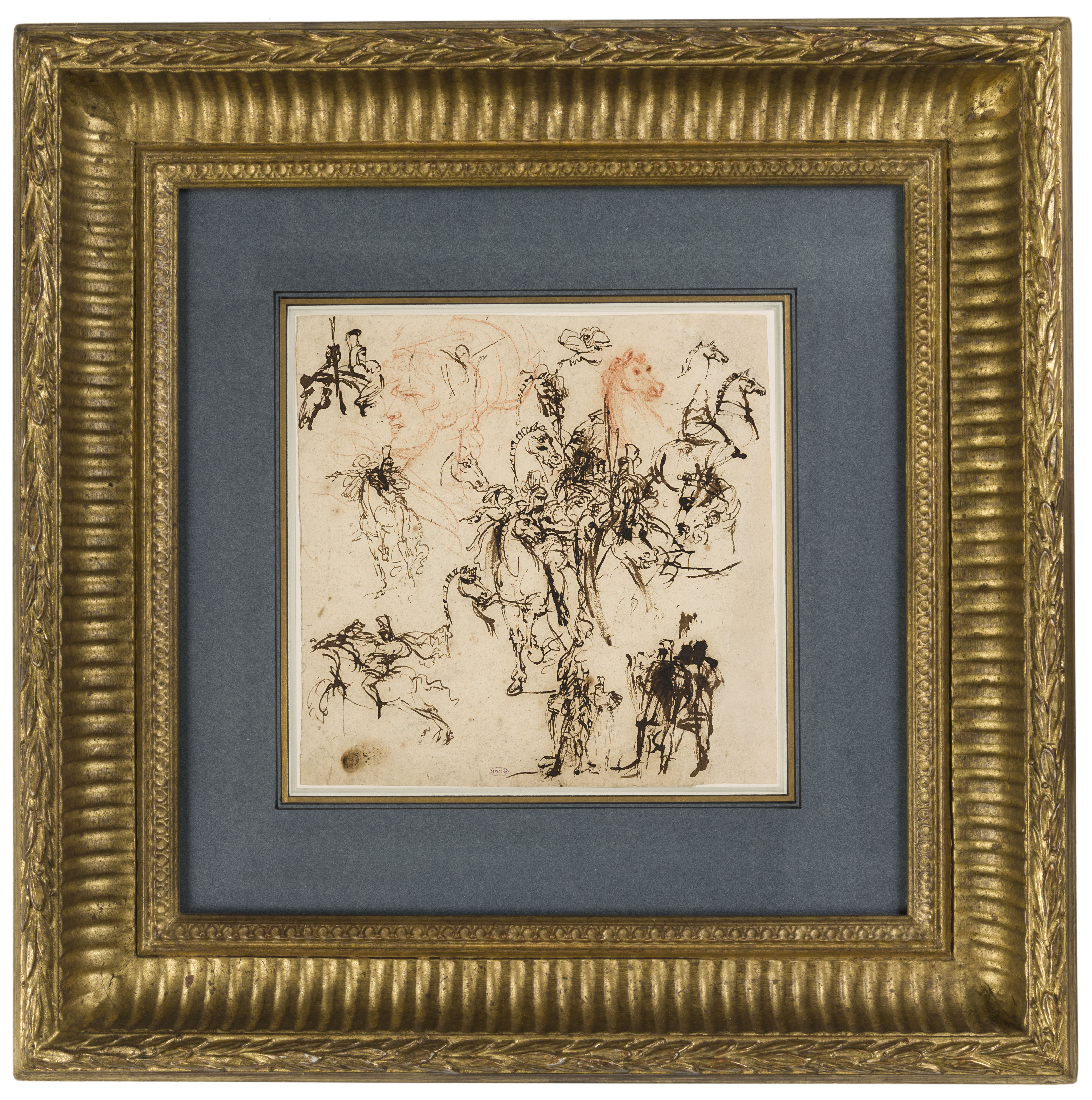 The present sheet of studies remains unconnected with any surviving work by Baron Gros, and as such is difficult to date with any accuracy. It may conceivably be an early work by the artist, at a time when he was one of the leading members of David’s studio, and perhaps before his trip to Italy. To judge from the antique armour worn by many of the figures in this drawing, the artist was here working out ideas for a classical composition of the type made famous by his master, yet the vigorousness of the pen technique, and in particular the attitudes of the horses, are far removed from David’s restrained manner and reveal something of Gros’s innate Romantic sensibility. The study of a soldier wearing an antique helmet, drawn in red chalk, finds some parallels with a similar figure in Gros’s large canvas of Eleazar Choosing Death over Eating Forbidden Meats, painted for the Prix de Rome competition of 1792 and today in the Musée des Beaux-Arts in Saint-Lô.