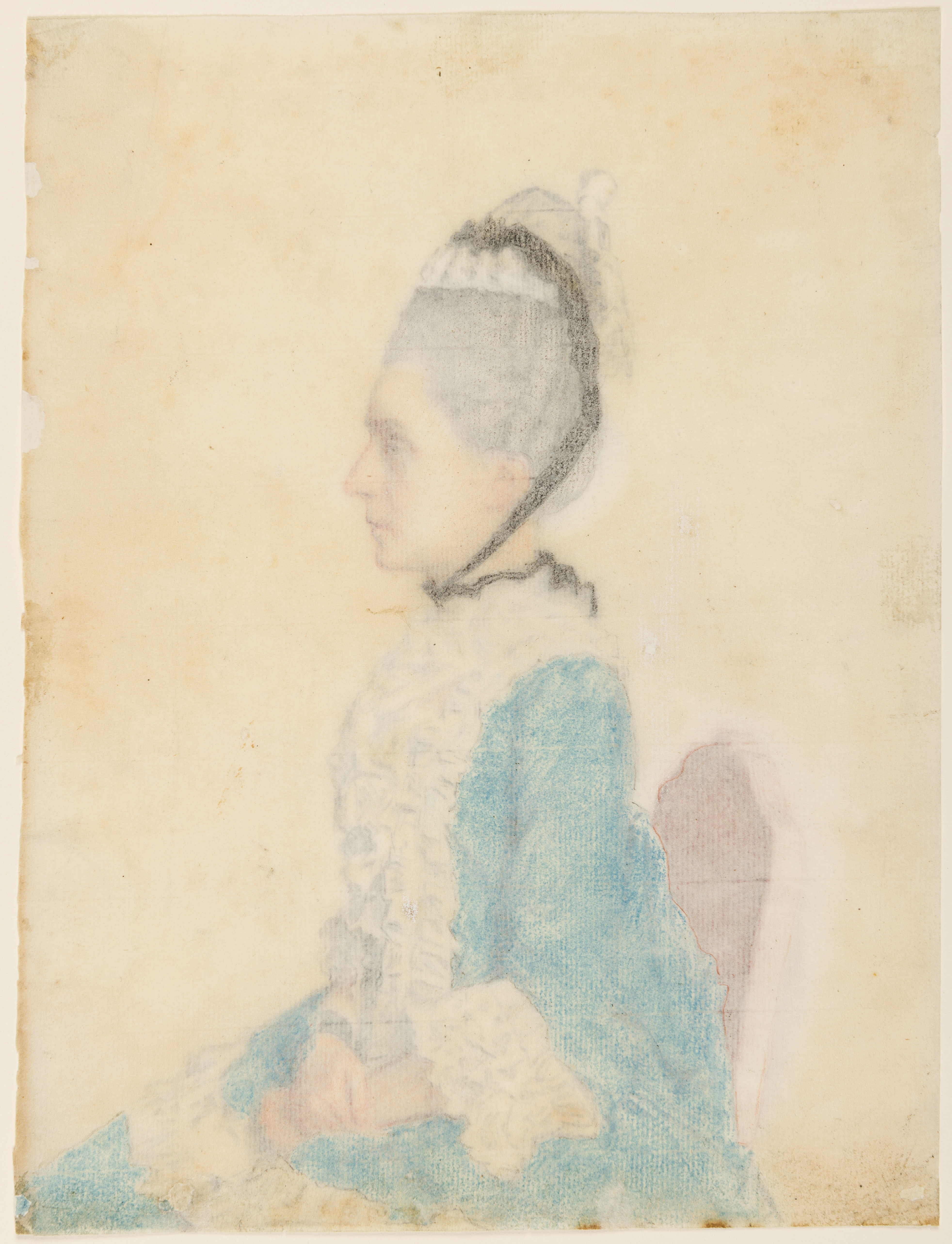 It has been suggested that this intimate portrait drawing depicts an as-yet unidentified woman from Geneva. The drawing can be dated to the period after 1757, when Liotard and his new wife settled in the Swiss city. On a stylistic basis, the drawing may perhaps be placed more precisely in the late 1770s, by comparison with such works of this date as a profile portrait drawing of the artist’s daughter Marie-Thérèse Liotard of c.1779, today in the collection of the Musée d’Art et d’Histoire in Geneva.