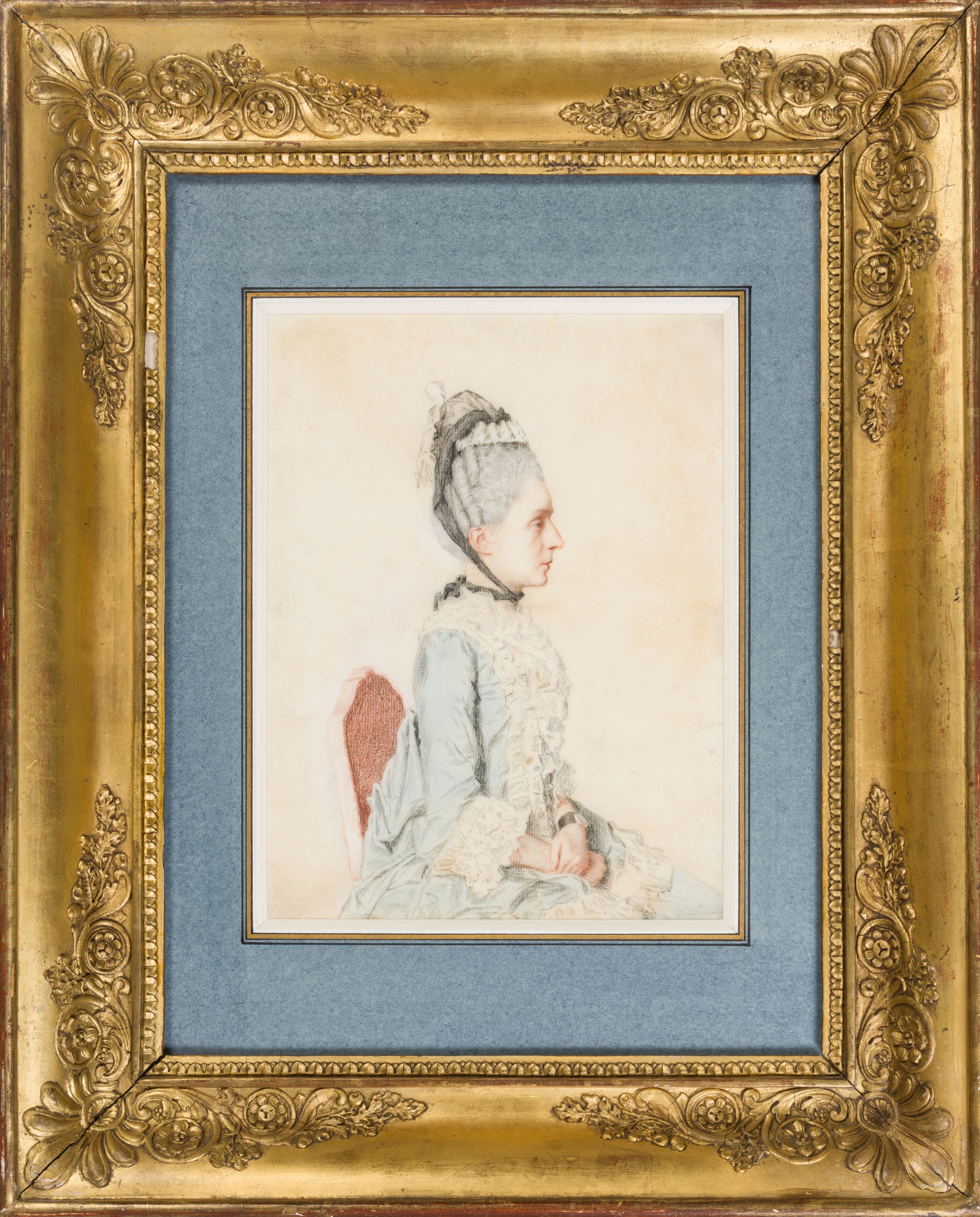 The present sheet is drawn in a combination of coloured chalks on a very thin, almost translucent sheet of white paper. The artist then traced the outlines from the recto onto the verso with slender lines of red and black chalk, before adding larger areas of tone in pale blue and black chalk. The thinness of the paper allows the areas of colouring on the verso to show through onto the recto, thereby creating a greater sense of depth and modelling in the features of the sitter. This precise and refined silhouetting of the figure on the verso of the sheet, creating a ‘negative’ image of the portrait on the recto, is entirely characteristic of Liotard’s working practice during his time in Geneva in the late 1750s and 1760s. As Christian Rümelin has noted of the artist, ‘beginning in 1758, he repeatedly resorted to a method he had already used during his stay in Rome, treating the reverse of relatively thin paper in a technique known from miniature painting. Adding colors to the back of portions of a composition heightens the intensity of those on the front, owing to the slight transparency of the paper. He did not employ this technique systematically, but only in autonomous drawings.’