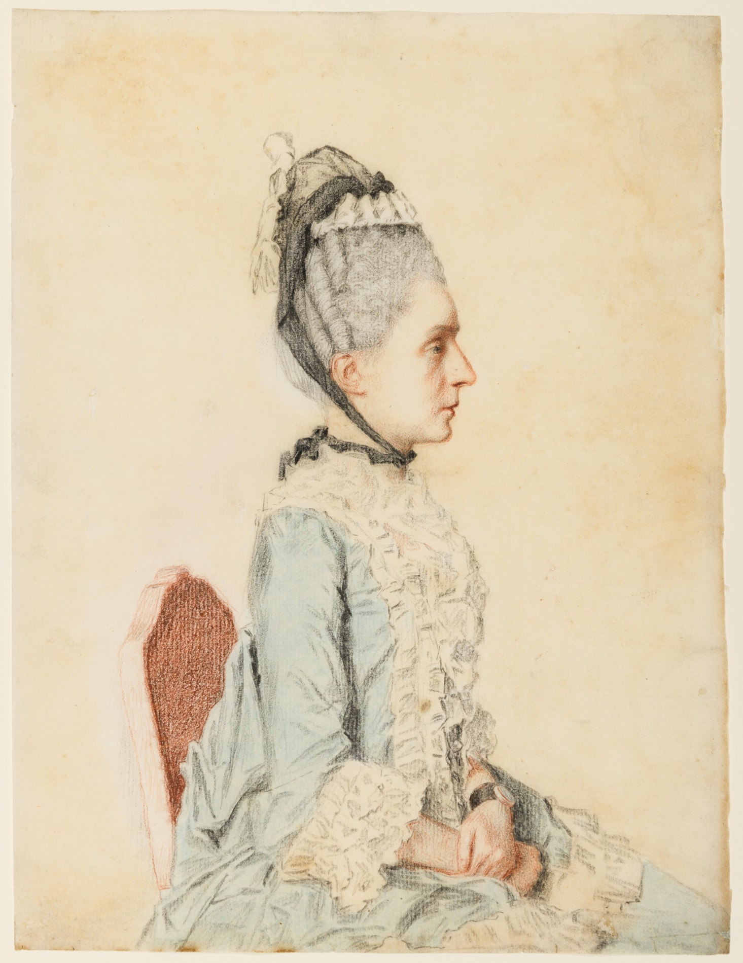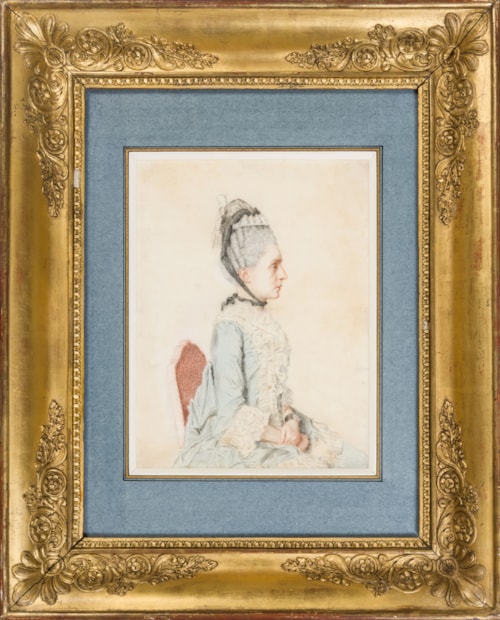 It has been suggested that this intimate portrait drawing depicts an as-yet unidentified woman from Geneva. The drawing can be dated to the period after 1757, when Liotard and his new wife settled in the Swiss city. On a stylistic basis, the drawing may perhaps be placed more precisely in the late 1770s, by comparison with such works of this date as a profile portrait drawing of the artist’s daughter Marie-Thérèse Liotard of c.1779, today in the collection of the Musée d’Art et d’Histoire in Geneva.