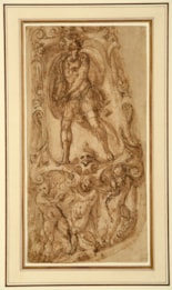 The unusual shape of this spirited pen and ink drawing has led to the suggestion that it may represent a design for part of an elaborate suit of embossed all’antica parade or pageant armour. A product of the Late Renaissance, highly ornamented parade armour was the result of a renewed interest in ‘the splendid decorative armor described in ancient literature and shown in ancient sculpture, worn by victorious generals in triumphal processions.’ The relief decoration of such armour would have been embossed into the metal, thus achieving a highly decorative, rather than defensive, result. Suits of parade armour of this type may be found in the Wallace Collection in London, the Real Armería de Madrid and the Metropolitan Museum of Art in New York.