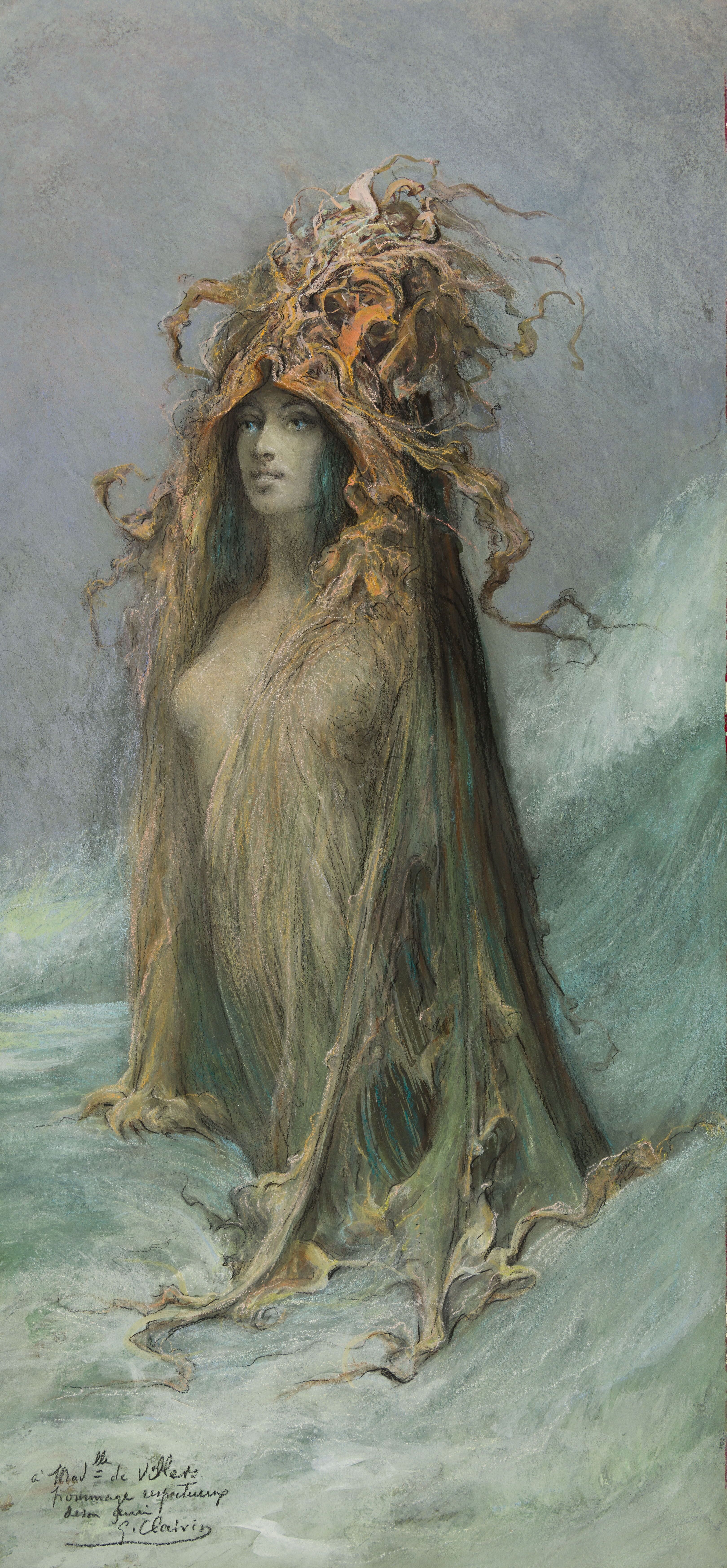 Apart from his better-known historical scenes, Orientalist subjects and landscapes, Georges Clairin also produced a small but choice body of work in a more Symbolist vein, often devoted to an exotic theme as represented by an enigmatic female figure. As has been noted of the artist, ‘sometimes going beyond the deserts and the ocean, further than anything reality offered his gaze, he scaled the infinite, he threw himself into a pure dream and he anchored on the canvas adorable visions of women which satisfied his thirst for colour; these are figures of enchantresses, living flowers, possessing an original capriciousness, in a languid pose, an unexpected event where the painter found the perfect opportunity for an innovative effort of decoration.’ Often associated with a marine motif in Clairin’s personal mythology, women were a constant source of inspiration for the painter, while the theme of the sea, and in particular the wave, was a popular subject among Symbolist artists of the 19th century in France.