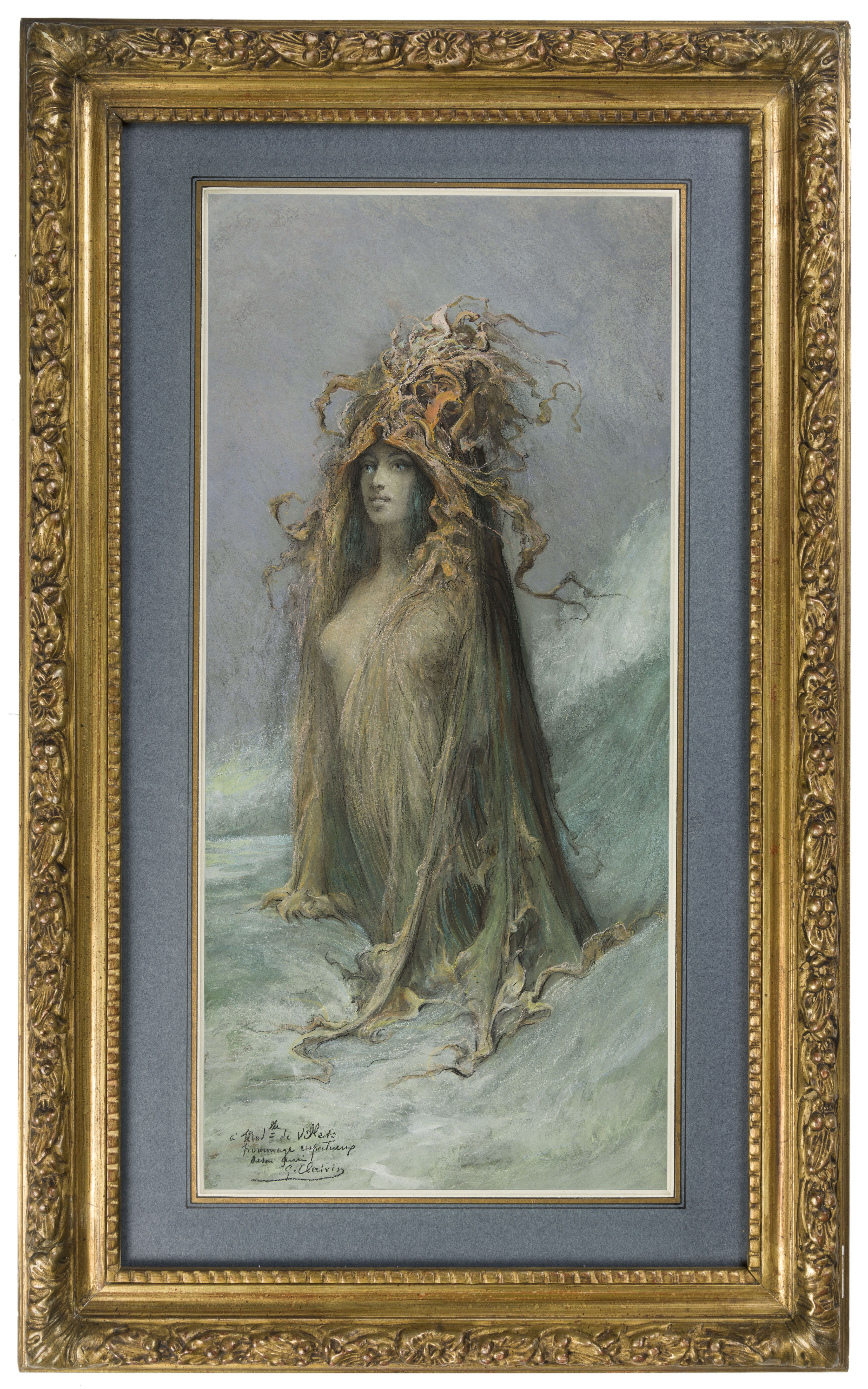 A similar subject appears in Clairin’s well-known painting La Grande Vague (The Great Wave), painted in 1898 and exhibited at the Salon des Artistes Français the same year and at the Exposition Universelle of 1900. A finished preparatory drawing in watercolour and gouache for La Grande Vague was in a private collection in Paris in 1986, while another study for the painting recently appeared at auction in France; both are similar in spirit to the present sheet. Also akin to this large drawing is a remarkable watercolour and gouache study of a nymph with a coral-like headdress, dated 1899 and dedicated by Clairin to the glass and jewellery designer René Lalique, which was sold at auction in London in 2008, and a related drawing in black and white chalk that appeared at auction in Paris in 2017.