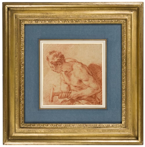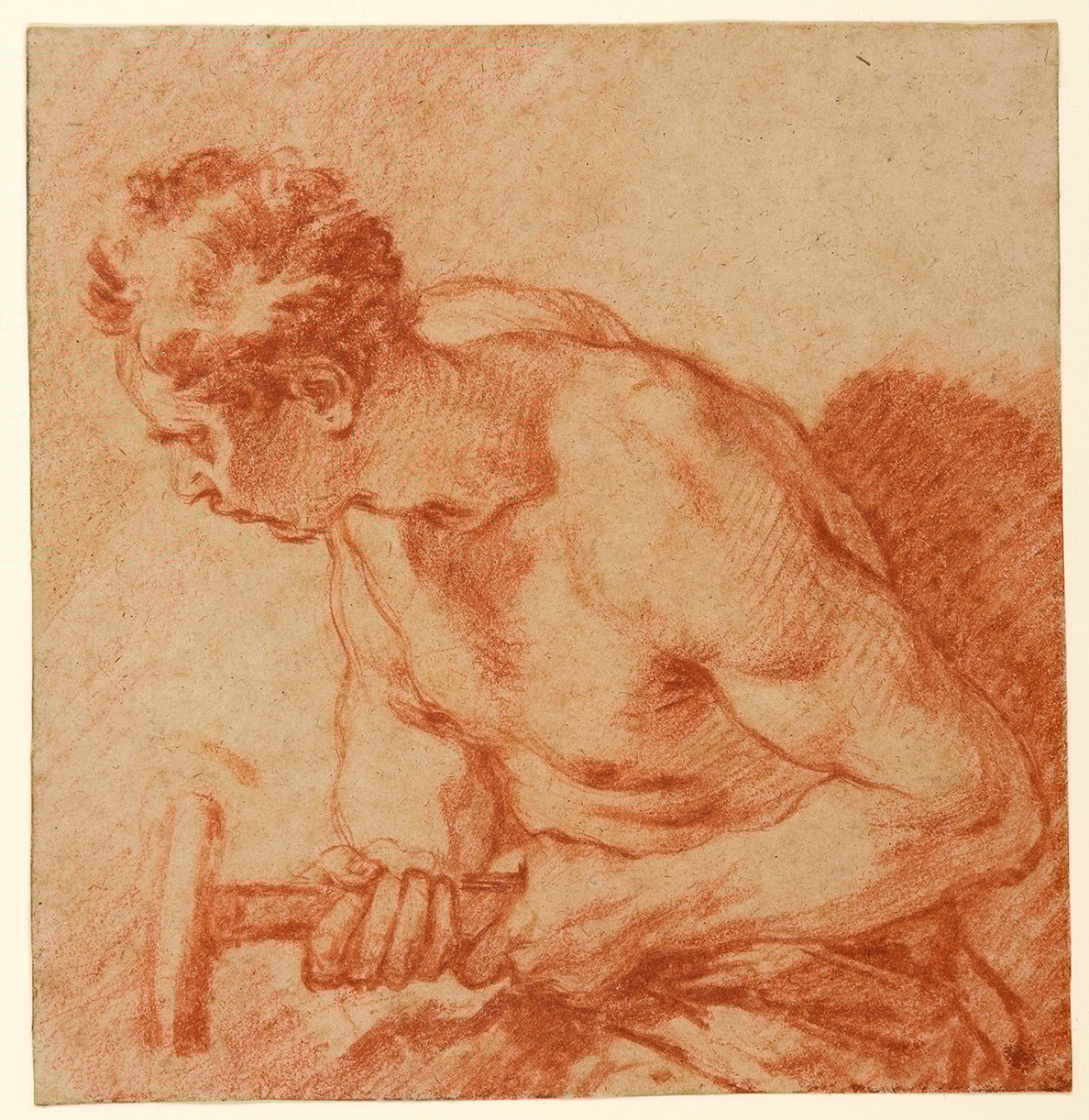 Boucher presumably drew the present sheet before he had determined the definitive composition of the painting. Although the figure is reversed in the final painting, and the artist may therefore have used a counterproof of this drawing to reorient the figure, the position of the hands in the drawing is close to that of the right-hand forger in the painting. The present sheet may also have been used for a similar figure in the Beauvais tapestry noted above.