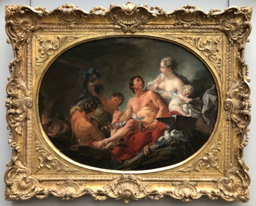 It has been suggested, however, that the Venus at the Forge of Vulcan and a pendant painting of Venus Presenting Aeneas to the Gods (or The Apotheosis of Aeneas), now in the Musée-Promenade de Marly-le-Roi in Louveciennes, may have initially been commissioned in 1746 for the redecorated apartments of the soon to be married Dauphin at Versailles, before the intended destination of the works was changed to Marly. The painting of Venus at the Forge of Vulcan is described in the mémoire as ‘4 pieds de long sur 3 et demi de haute représente Vénus qui prie Vulcain de forger des arms pour Enée; ce tableau est compose de huit figures’, and in the 1747 Salon livret as ‘Un Tableau ovale, representant les Forges de Vulcain. Ce tableau est destine pour la Chambre à coucher du Roy à Marly’. Boucher received the final payment for both works in February 1748. Not long thereafter the composition was adapted and enlarged by the artist in a design for a tapestry to be woven at the Beauvais tapestry works.