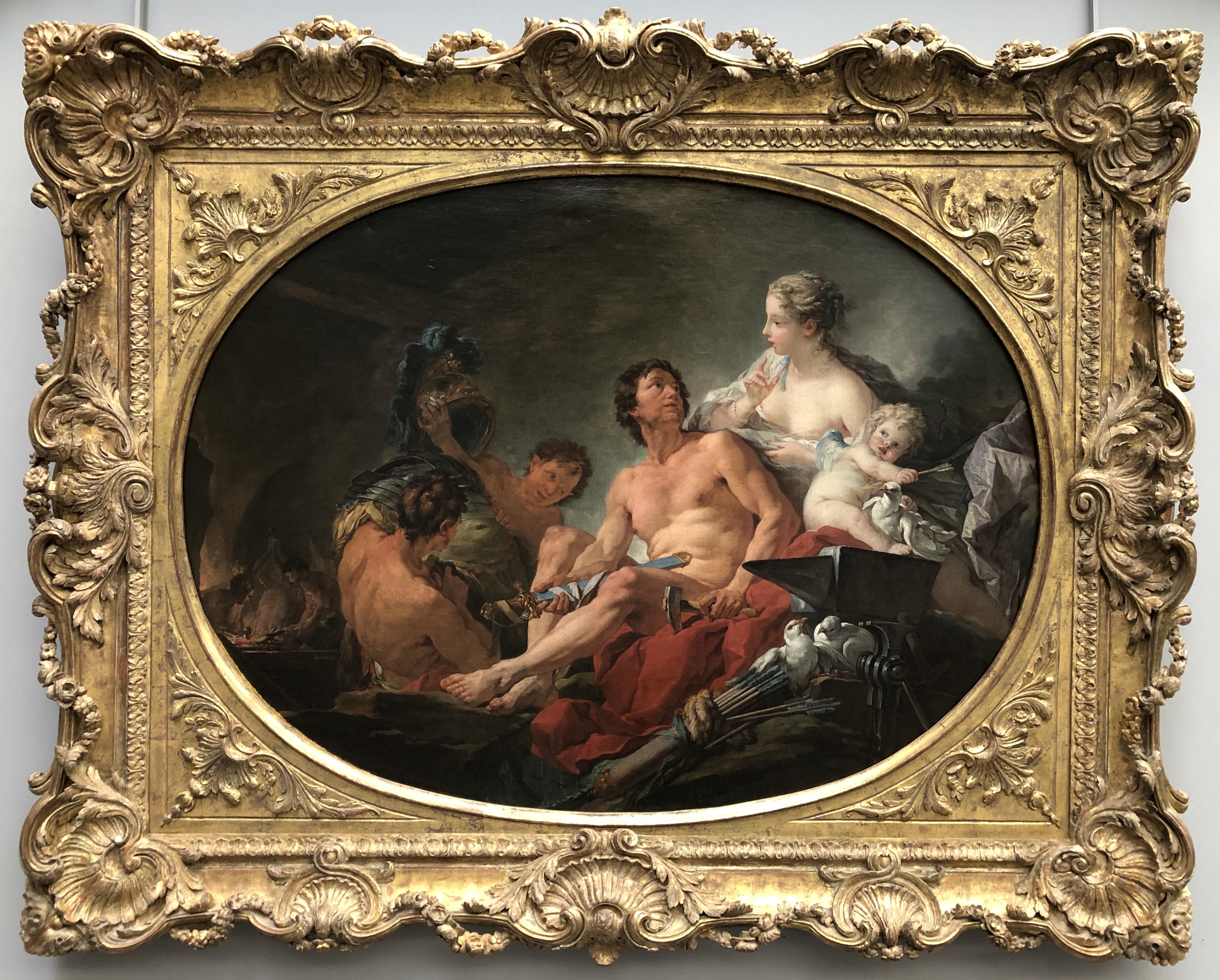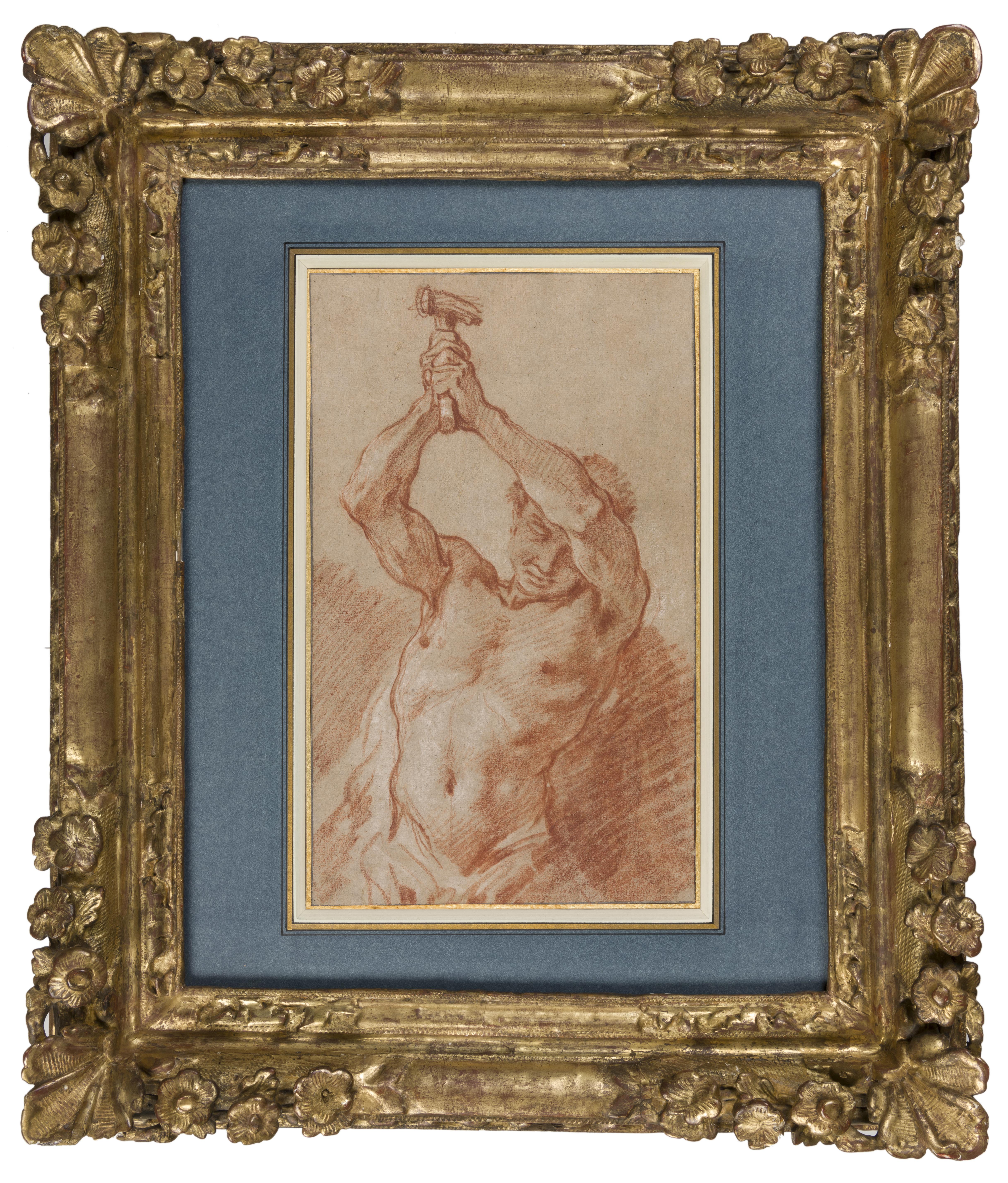 A number of drawings of male nudes by Boucher, however, were not done as teaching exercises but as preparatory studies for paintings. As Alastair Laing has noted of this drawing, ‘[It] is a genuine study for a painting, rather than a derivative from a painting, done for collectors.’ The drawing may be related to an important painting by the artist; the Venus at the Forge of Vulcan, dated 1747, in the Louvre. A monochrome oil sketch for the composition is in the Louvre, while a drawing for a different forger in the painting, executed in black chalk, is in the Musée Sainte-Croix in Poitiers. A study for the Cupid with arrows and a dove may have been made after the figure in the painting, as a drawing for a collector, rather than as a preparatory study for it. No other preparatory drawings related to the painting of Venus at the Forge of Vulcan are known.