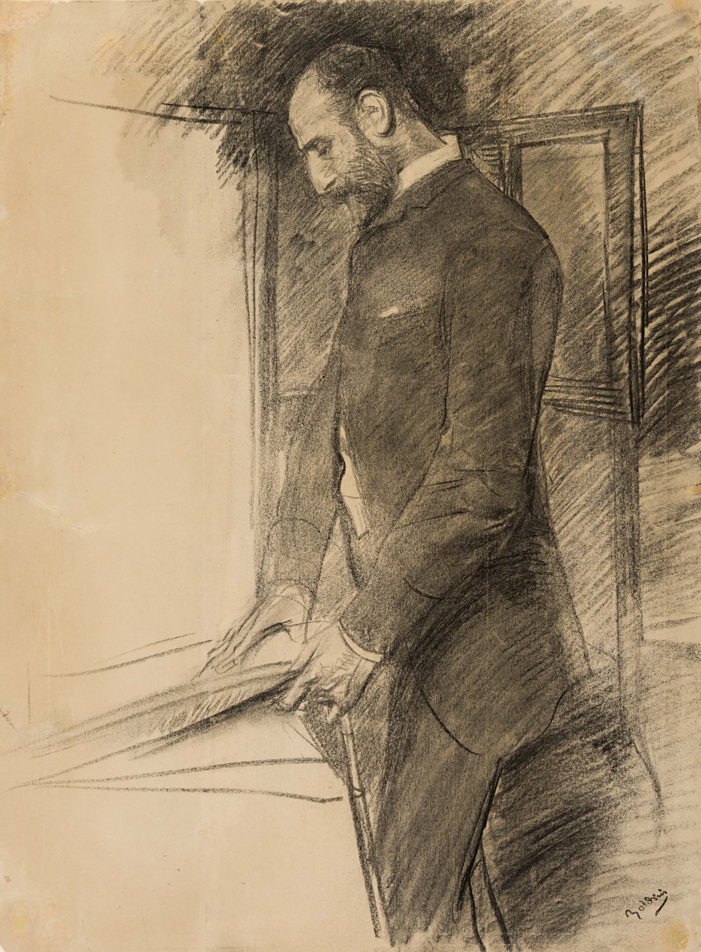 Boldini was a gifted and somewhat compulsive draughtsman, and filled many sketchbooks with drawings. (He would also use whatever paper came to hand, and there are examples of quick sketches drawn on menu covers, receipts, ledger paper, postcards, hotel stationery, pages torn from auction catalogues, and so forth.) His drawings, characterized by a restless energy and a spirited technique wholly in keeping with the bravura brushwork of his oil paintings, range from quick sketches of figures, landscapes, buildings and objects to more elaborate studies of these same motifs. As Richard Kendall has recently written, ‘Evident in almost all of [Boldini’s drawings] is a vivid engagement with the pleasures of looking and with the nervous exuberance of the drawing process, irrespective of the chosen subject…Some of these drawings would have taken only minutes or even seconds to complete, while others are the work of hours of concentrated labor…This engagement was vividly physical and sensuous, as his hand erupted in wild flourishes of pencil, pen and ink, crayon, and charcoal, or opted for extreme delicacy as the situation demanded.’ The largest surviving group of drawings by Boldini, bequeathed by the artist’s widow, is today in the collection of the Museo Boldini in Ferrara.