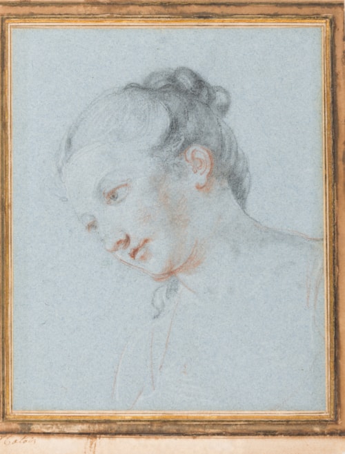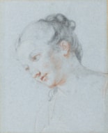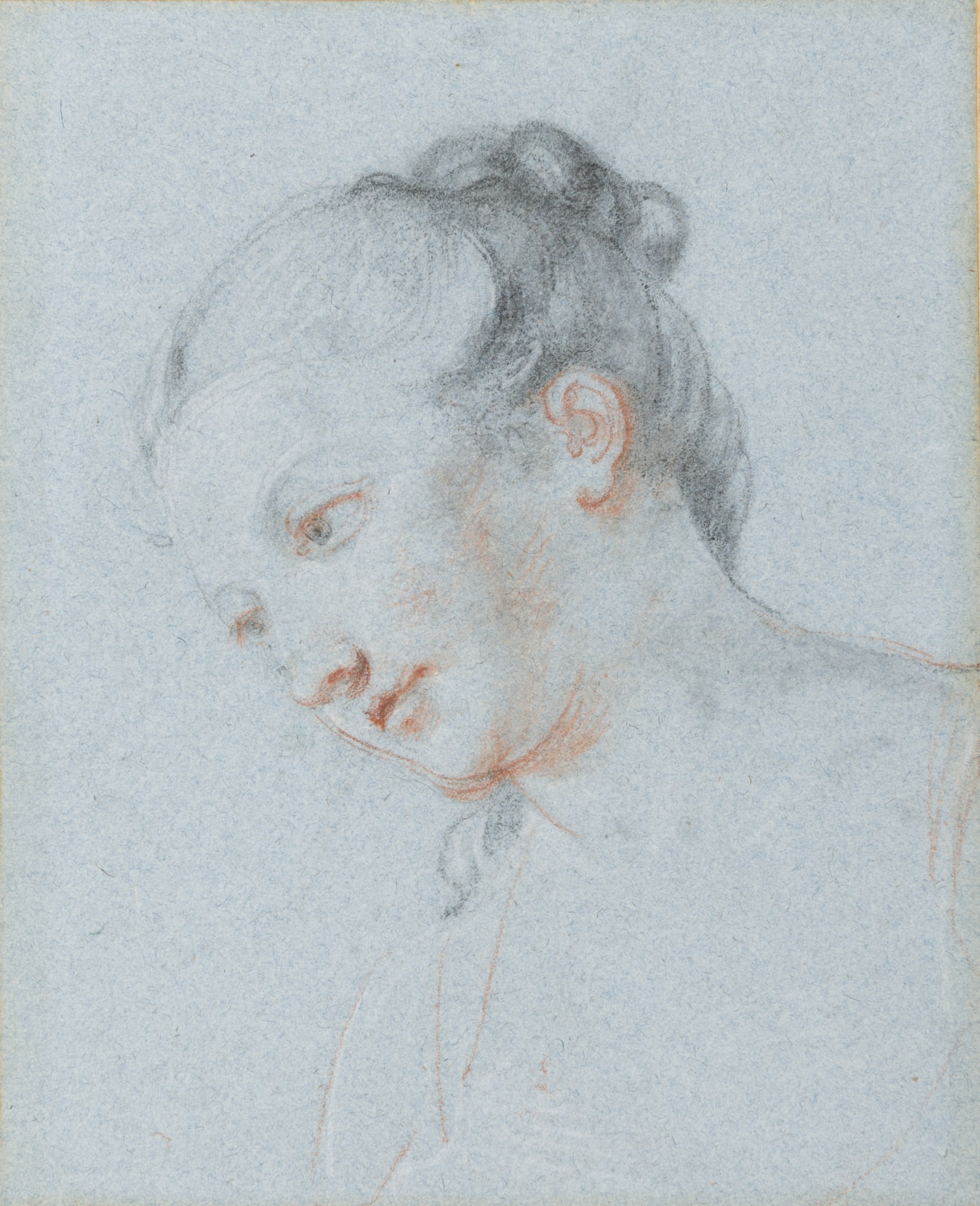 Delicately drawn in a combination of black, red and white chalks on blue paper, the present sheet depicts a type of female head that is found throughout Charles-Joseph Natoire’s oeuvre as a painter. It would in particular appear to be a preparatory study for the head of a woman riding a donkey in his painting of Travellers Resting by a Fountain, one of a pair of large canvases executed in 1737 for the dining room of Louis XV’s petits appartements at the Château of Fontainebleau, and today in a private collection. The painting was one of a set of six canvases commissioned from Natoire for the King’s private apartments at Fontainebleau, where they remained until 1792. (Lost after the French Revolution, the paintings were only rediscovered some two hundred years later.) A closely-related painting of the same composition of Travellers Resting by a Fountain by Natoire, but horizontal in orientation, is in the Hood Museum of Art at Dartmouth College in Hanover, New Hampshire.