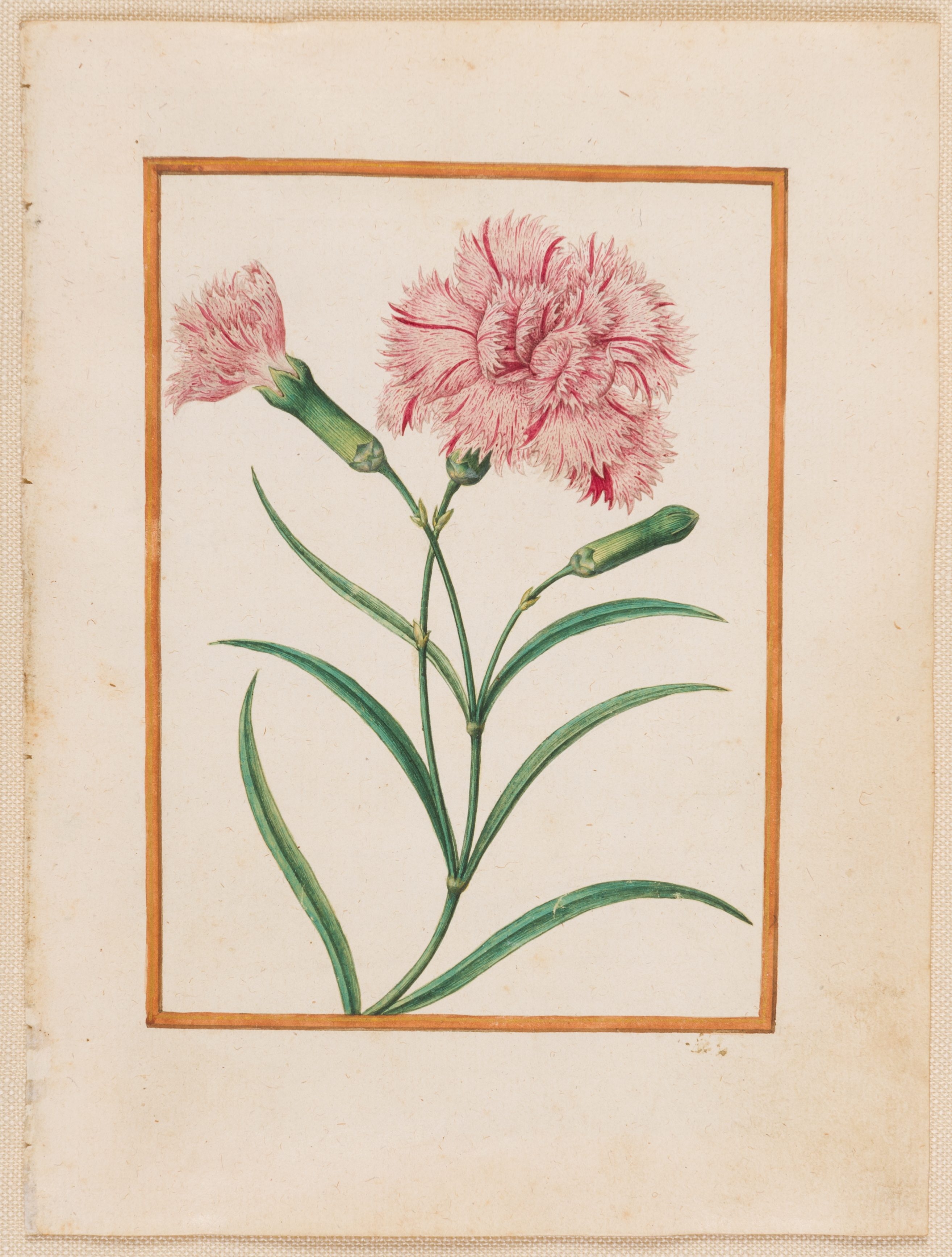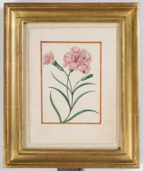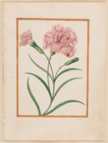 The wild ancestor of the garden carnation, the clove pink is a plant with clove-scented flowers, and was used as a medicinal and culinary herb, as an aromatic and for flavouring. Le Moyne seems to have been particularly fond of clove pinks, which appear several times in his oeuvre. The ‘Du Marry’ album, from which the present sheet originates, included two other studies of clove pinks, albeit each very different in composition. A similar study of a clove pinks is also found in the album of watercolours of flowers, fruit and butterflies by Le Moyne in the Victoria and Albert Museum in London. A depiction of clove pinks with a small butterfly by Le Moyne was part of a group of six small gouache drawings on vellum, formerly in the manuscript collection of Eric Korner, which were sold at auction in 1997. A sheet of studies of five clove pinks, drawn in watercolour and gouache in a more informal manner, was sold at auction in New York in 2004.