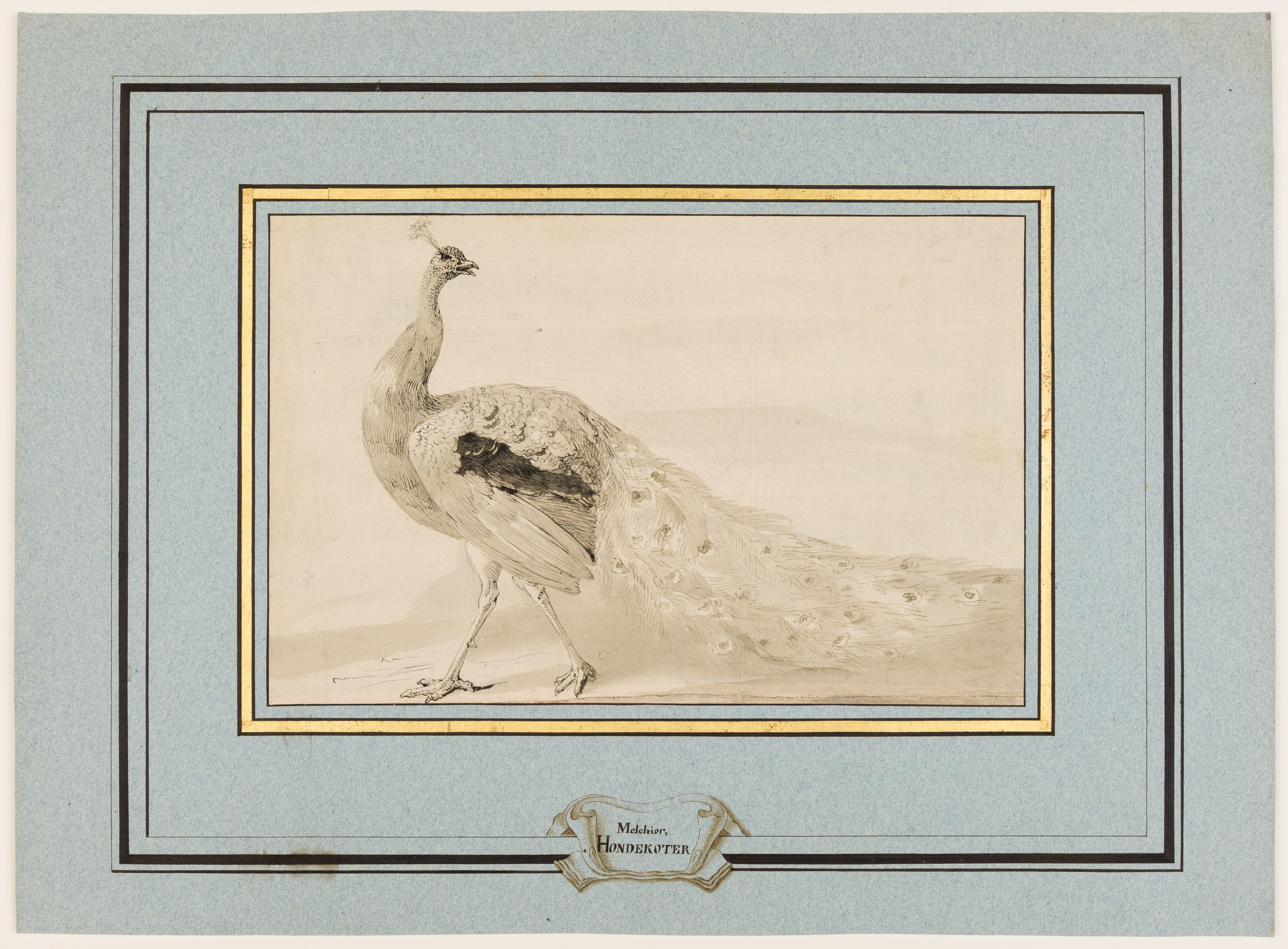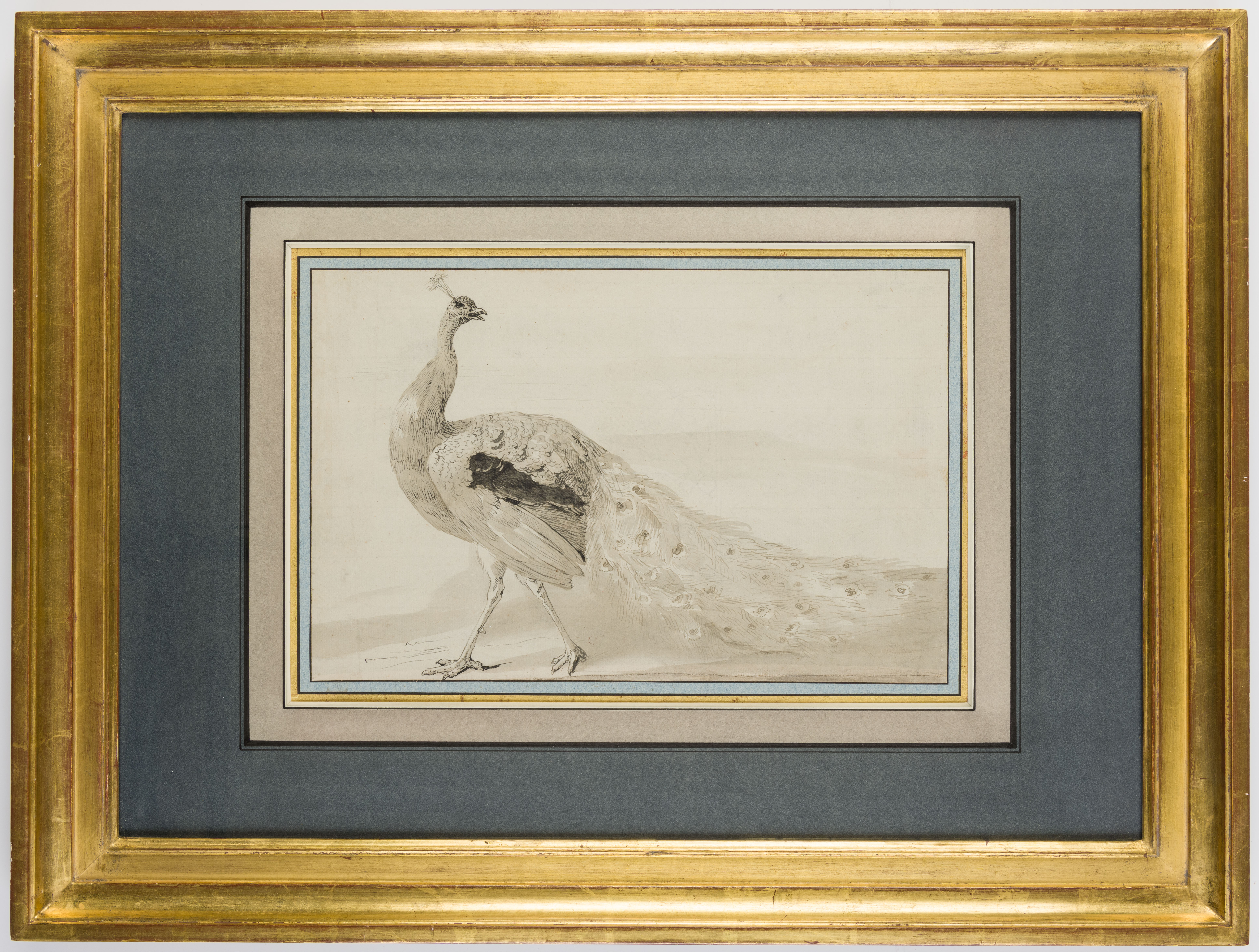 This fine sheet is one the very few drawings by Hondecoeter which appear to have been produced as a preparatory study for a painting. The same peacock seen in this drawing, striding to the left, is found in a signed painting by Hondecoeter of A Monkey, Peacock and Other Birds, datable to the decade of the 1660s, which appeared at auction in London in 1995. A very similar peacock is also found in a large painting of Birds in a Park of 1686, in the collection of the Hermitage in St. Petersburg.