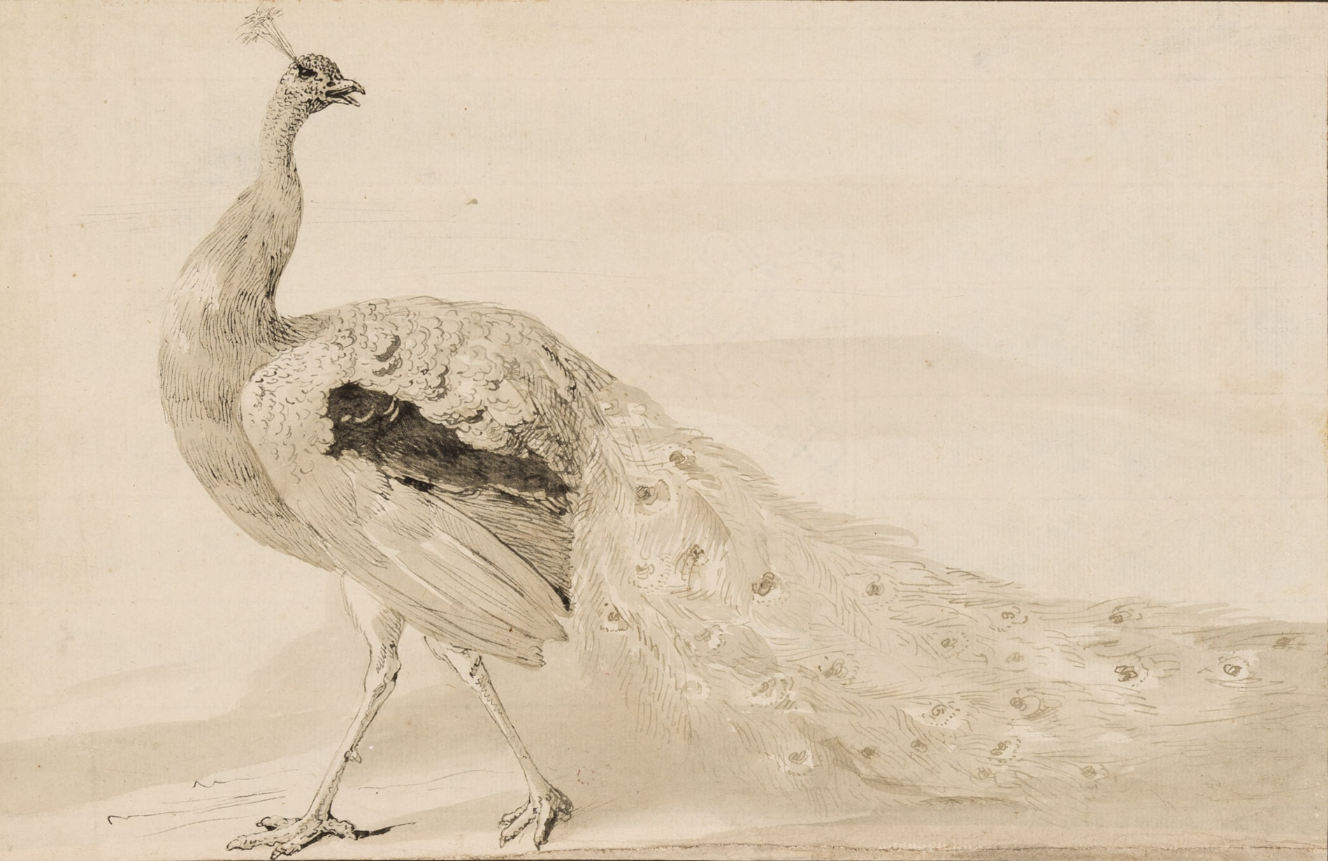 This fine sheet is one the very few drawings by Hondecoeter which appear to have been produced as a preparatory study for a painting. The same peacock seen in this drawing, striding to the left, is found in a signed painting by Hondecoeter of A Monkey, Peacock and Other Birds, datable to the decade of the 1660s, which appeared at auction in London in 1995. A very similar peacock is also found in a large painting of Birds in a Park of 1686, in the collection of the Hermitage in St. Petersburg.
