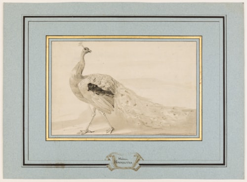 Among the few other extant drawings of peacocks by Hondecoeter is a similar pen and wash study of a single bird in the collection of the British Museum. Peacocks also appear in a finished watercolour of Two Peacocks, Five Chickens and a Parrot in the Albertina in Vienna, and in a watercolour composition of a peacock with several other birds in the British Museum, of which two autograph variants are known; one in the Klassik Stiftung Weimar in Weimar and another, formerly in the Goll van Franckenstein collection, which was sold at auction in 2016. A red chalk study of two peacocks, in the collection of the Rijksmuseum in Amsterdam, has long been regarded as autograph, but has recently been downgraded to the work of a pupil or follower of the artist.